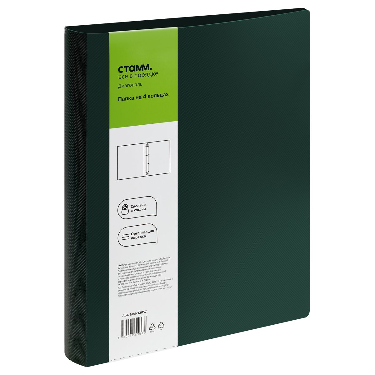 Папка на 4 кольцах СТАММ "Диагональ" А4, 40мм, 700мкм, пластик, изумруд