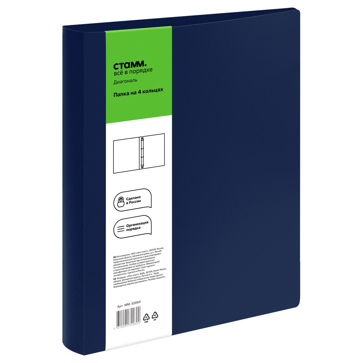 Папка на 4 кольцах СТАММ "Диагональ" А4, 40мм, 700мкм, пластик, сапфир