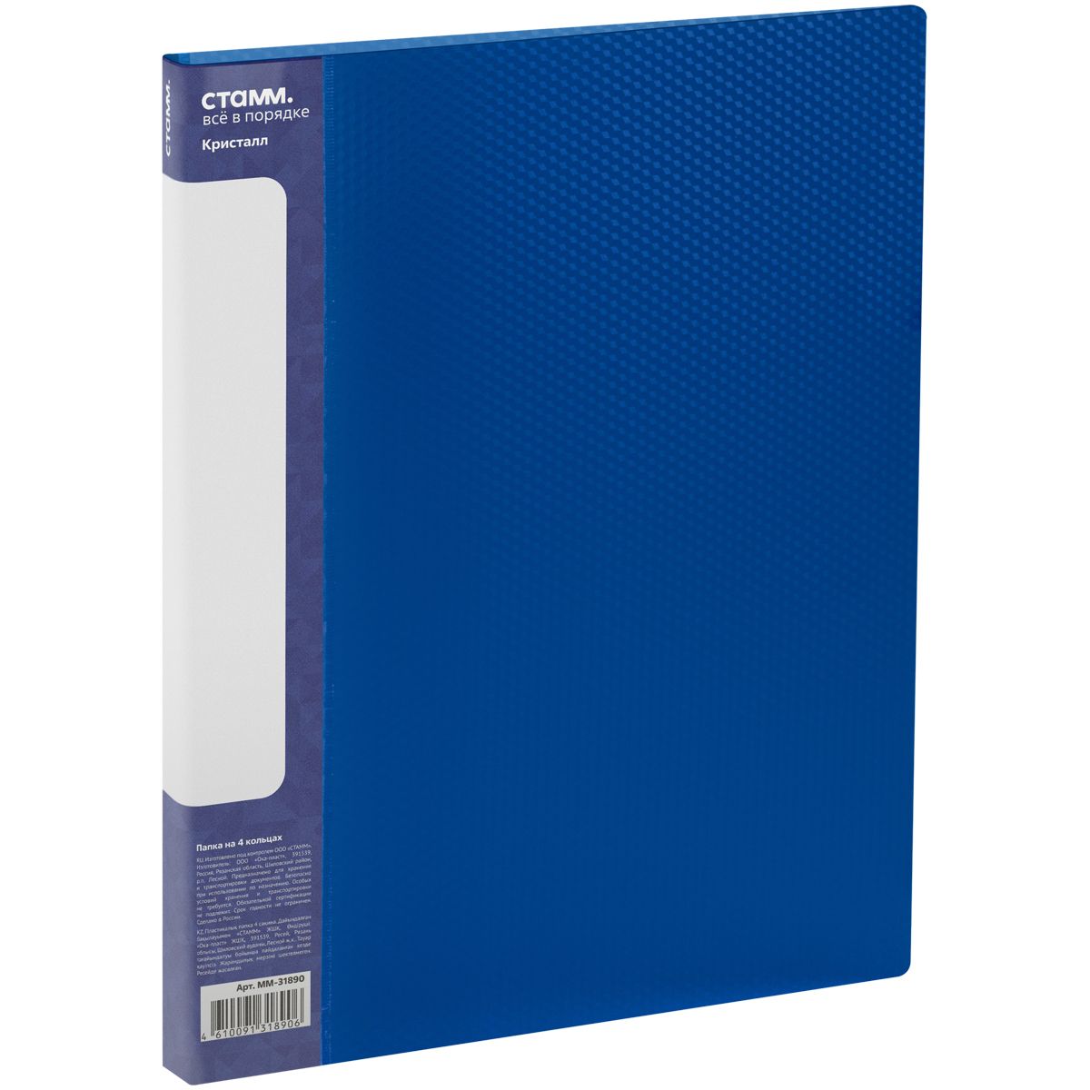 Папка на 4 кольцах СТАММ "Кристалл" А4, 25мм, 700мкм, пластик, синяя