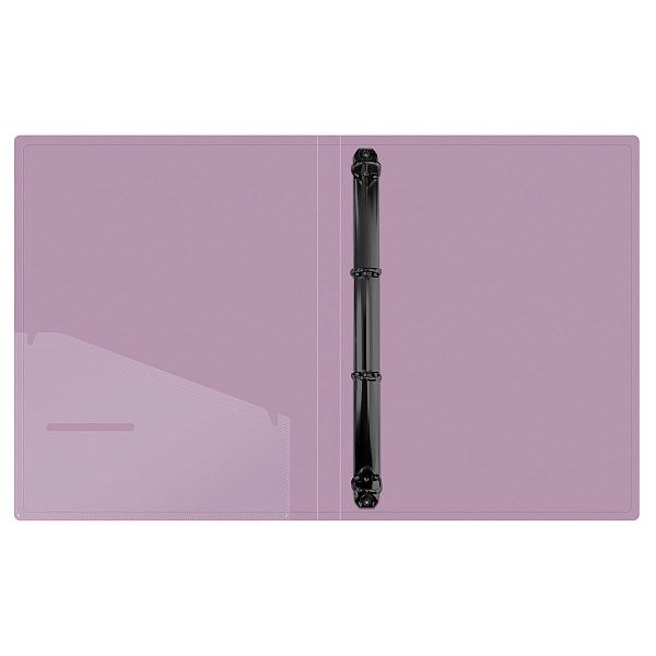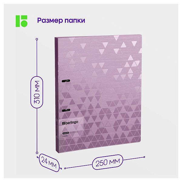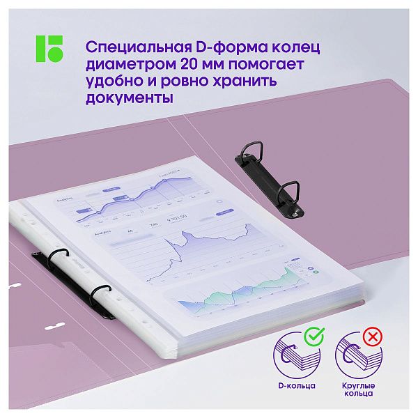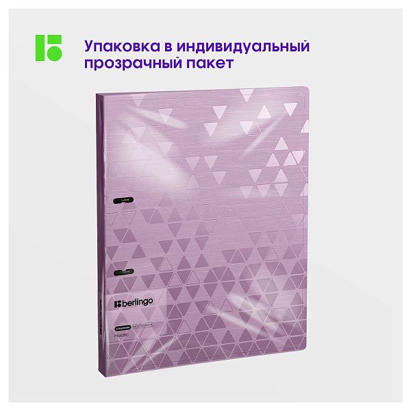 Папка на 2 кольцах Berlingo Instinct формата А4 станет стильным помощником для хранения документов. Размер изделия – 310*250*35 мм, ширина корешка – 35 мм, толщина материала – 700 мкм. Папка вмещает до 150 бумажных листов. Внешняя сторона изделия выполнена в нежном лавандовом цвете с фактурой «горизонтальные линии». Внутренняя сторона имеет чёрный цвет и оснащена плотным прозрачным карманом для удобного хранения мелочей: ручки, заметок, визиток, дисков, флешек и другого. Кольца диаметром 30 мм и фурнитура также выполнены в чёрном цвете. Специальная D-форма колец помогает удобно и ровно хранить документы, которые могут быть выровнены по левому краю благодаря боковой вертикальной стенке кольца. Формовые отверстия в обложке служат для надежного защелкивания папки в сложенном виде, предотвращают случайное открытие обложки и замятие документов при хранении и транспортировке. Папка упакована в индивидуальный прозрачный пакет по форме.