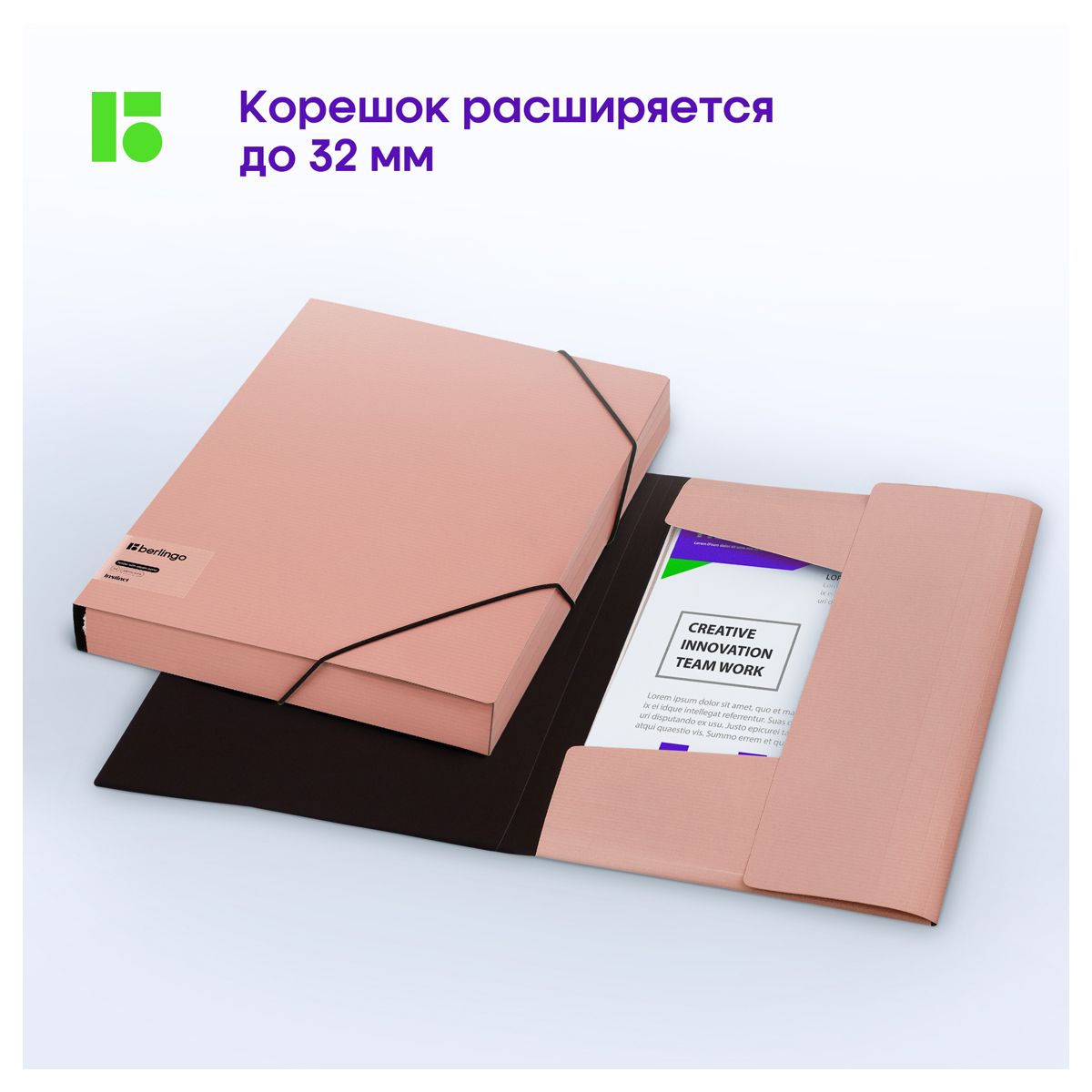 Надежные застежки-резинки. Быстрый доступ к содержимому. Насыщенный пастельный розовый цвет внешней стороны в сочетании с фактурой "горизонтальные линии", черный цвет внутренней поверхности. Предназначена для хранения документов. Толщина обложки 600 мкм. Упакована в индивидуальный прозрачный пакет по форме.