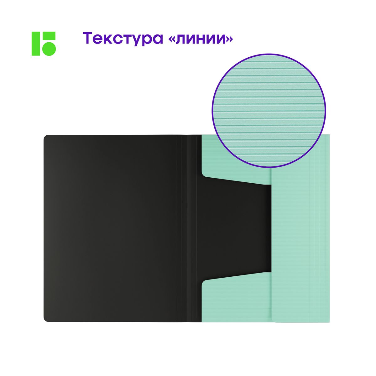 Надежные застежки-резинки. Быстрый доступ к содержимому. Мятный цвет внешней стороны в сочетании с фактурой "горизонтальные линии", черный цвет внутренней поверхности. Предназначена для хранения документов. Толщина обложки 600 мкм. Упакована в индивидуальный прозрачный пакет по форме.