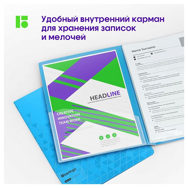 Модели оснащены вкладышами с перфорацией для удобного размещения листов, как у «Berlingo Папка с 30 вкладышами Radiance» , и часто имеют внутренние карманы для мелочей. Некоторые папки, такие как «Berlingo Папка-вкладыш Luxe, 110 мкм» , имеют расширяющуюся конструкцию для добавления документов.
