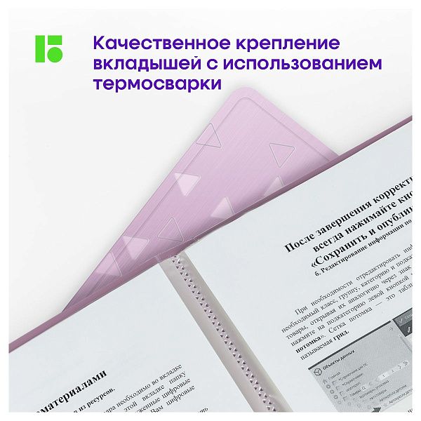 Папки изготовлены из прочного полипропилена или ПВХ, как, например, «Berlingo Папка с 20 вкладышами Radiance, 600 мкм» , с глянцевой поверхностью и цветными обложками. Некоторые модели, такие как «Berlingo Папка с 10 вкладышами Aqua» , имеют прозрачные вкладыши с яркими рисунками для эстетичного вида.