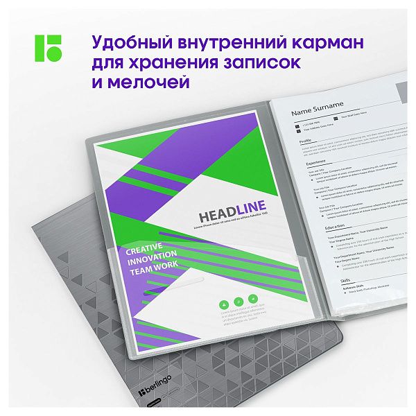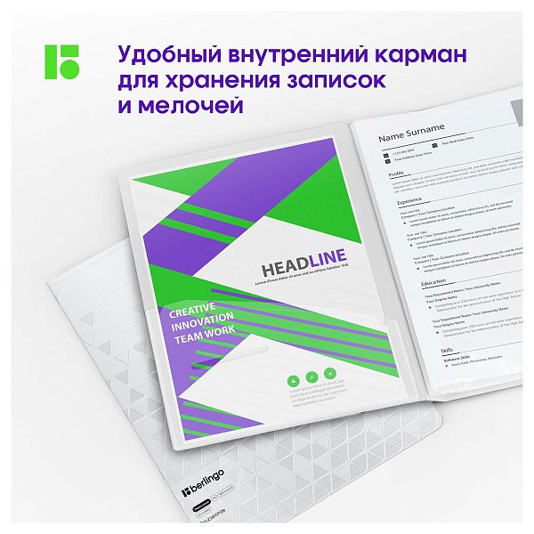 Модели оснащены вкладышами с перфорацией для удобного размещения листов, как у «Berlingo Папка с 30 вкладышами Radiance» , и часто имеют внутренние карманы для мелочей. Некоторые папки, такие как «Berlingo Папка-вкладыш Luxe, 110 мкм» , имеют расширяющуюся конструкцию для добавления документов.