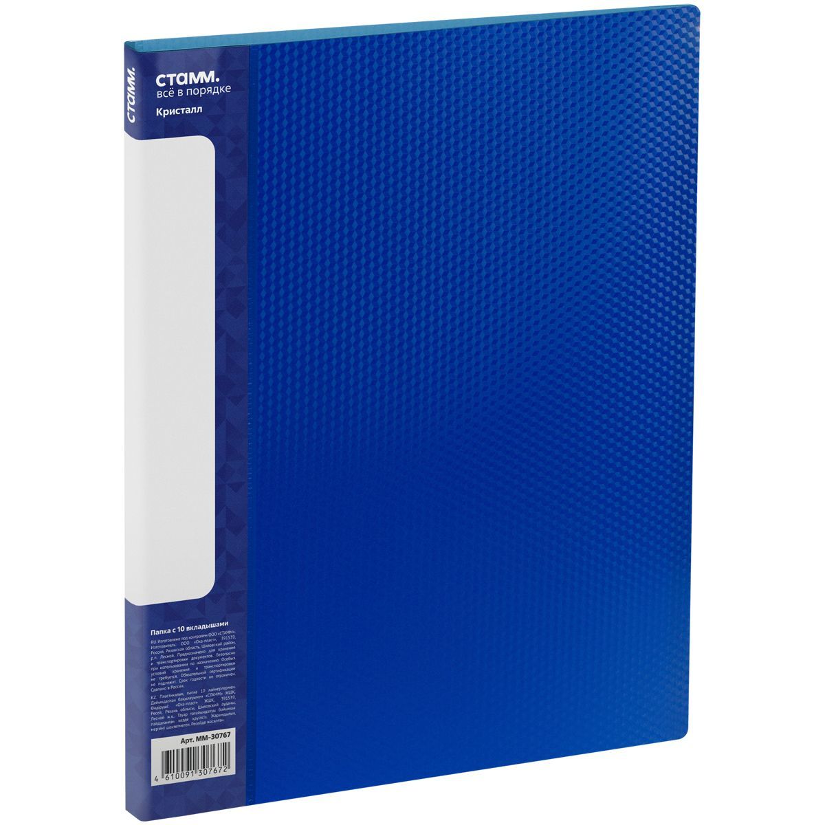Папка с 10 вкладышами СТАММ "Кристалл" А4, 9мм, 600мкм, пластик, синяя