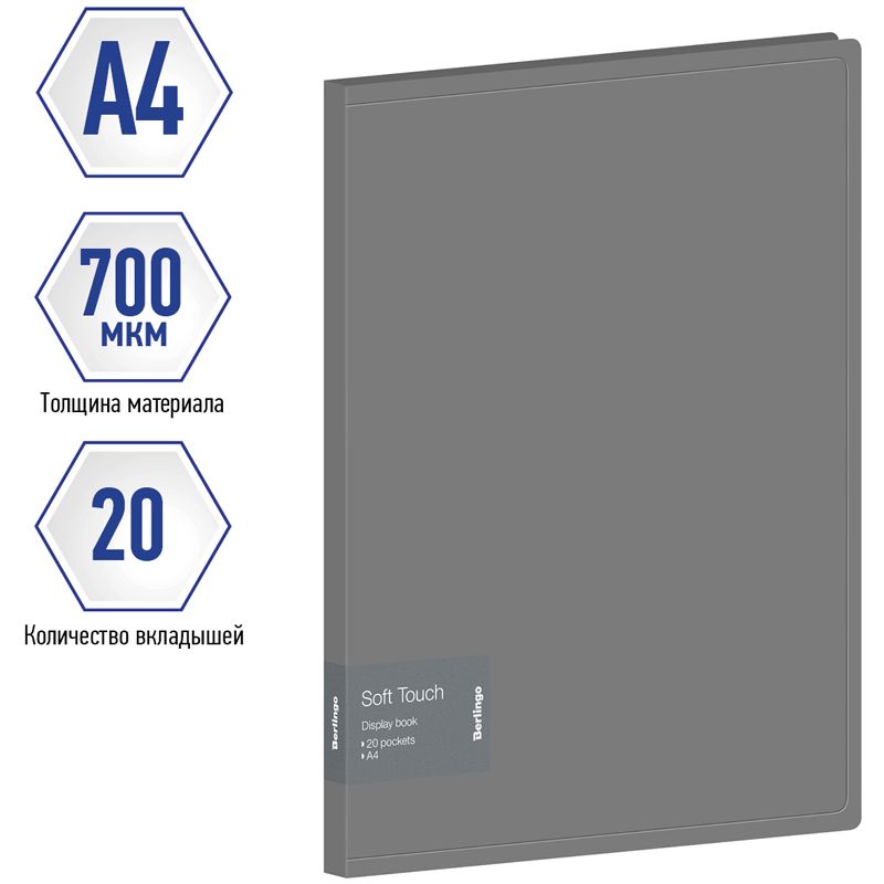 Папка с 20 вкладышами Berlingo "Soft Touch", 17мм, 700мкм, серая, с внутр. карманом