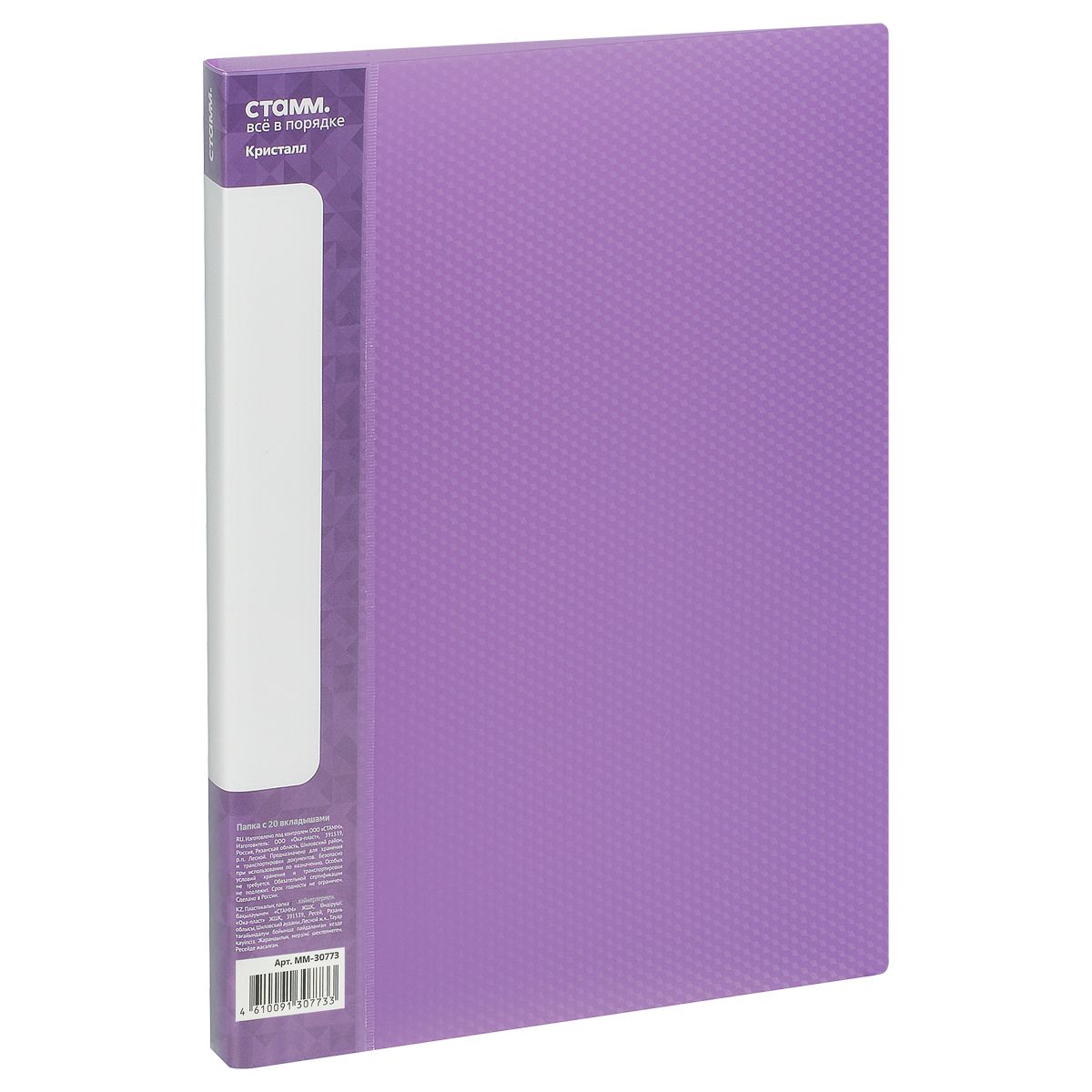 Папка с 20 вкладышами СТАММ серии "Кристалл" – отличный помощник для хранения бумаг формата А4. Изделие выполнено в полупрозрачном фиолетовом цвете. Внешняя сторона папки дополнена фактурным паттерном «Кристалл», сохраняющим внешний вид изделия от загрязнений и повреждений. Размер изделия составляет 235*310 мм. Ширина корешка – 14 мм. Тип скрепления – термосварка. Бумагам, вложенным в папку, не требуется перфорация дыроколом. На корешке папки есть удобный карман. Папка упакована в индивидуальный пакет.