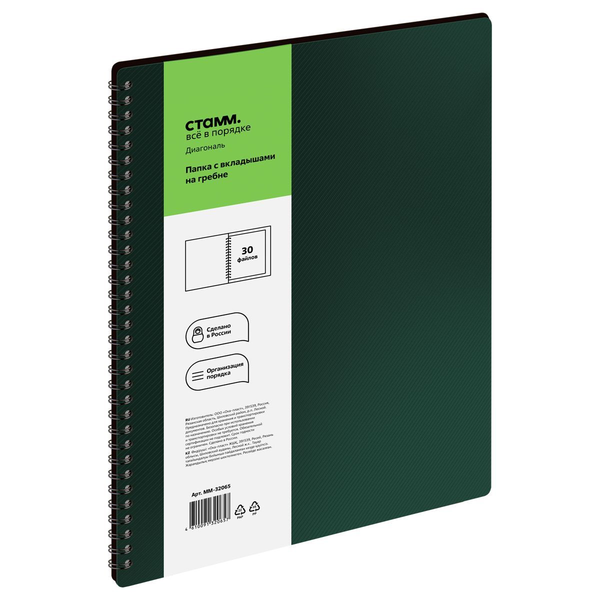 Папка с 30 вкладышами на гребне СТАММ "Диагональ" А4, 17мм, 700мкм, пластик, изумруд