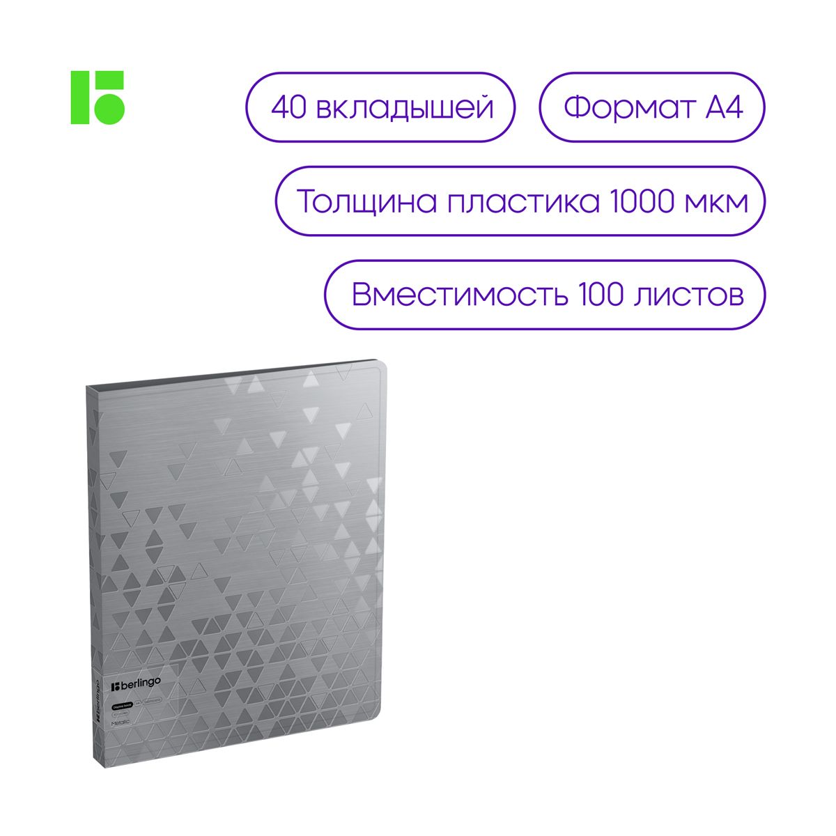 Папка с 40 вкладышами Berlingo "Metallic", 24мм, 1000мкм, серебряный металлик, с внутр. карманом