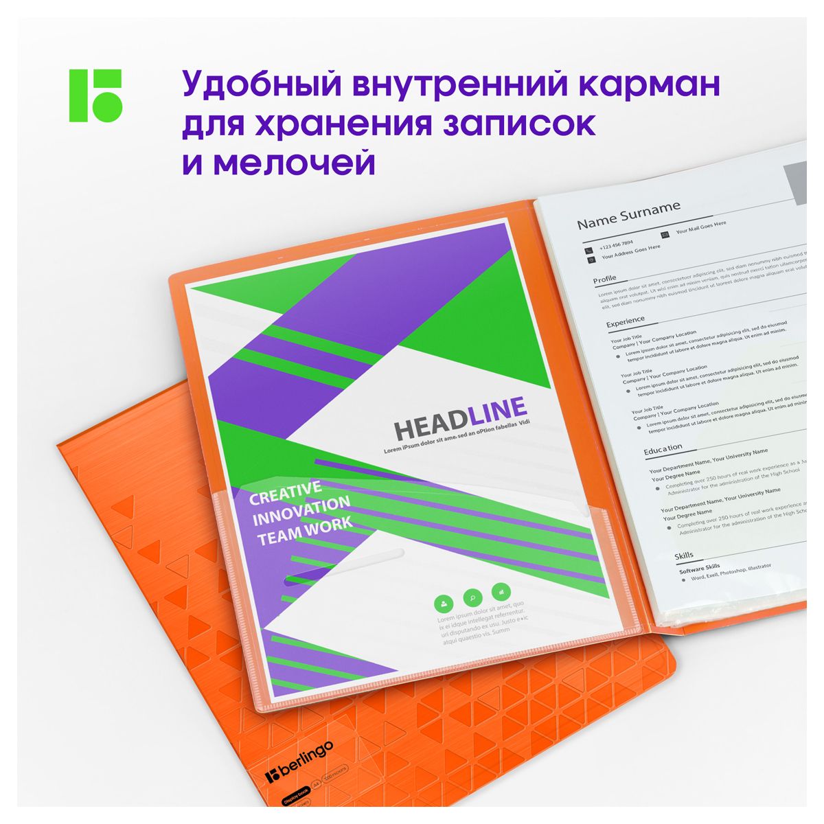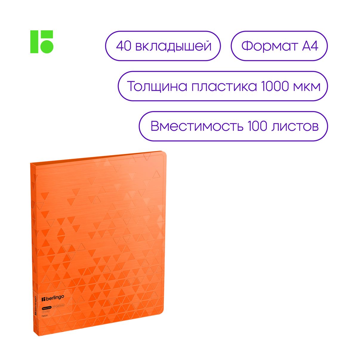 Папка с 40 вкладышами Berlingo "Neon", 24мм, 1000мкм, оранжевый неон, с внутр. карманом