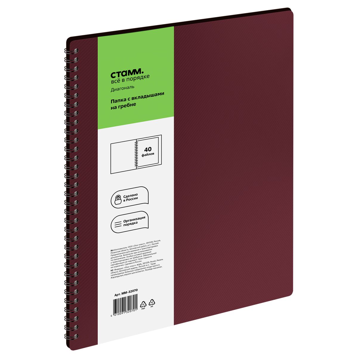 Папка с 40 вкладышами на гребне СТАММ "Диагональ" А4, 21мм, 700мкм, пластик, гранат
