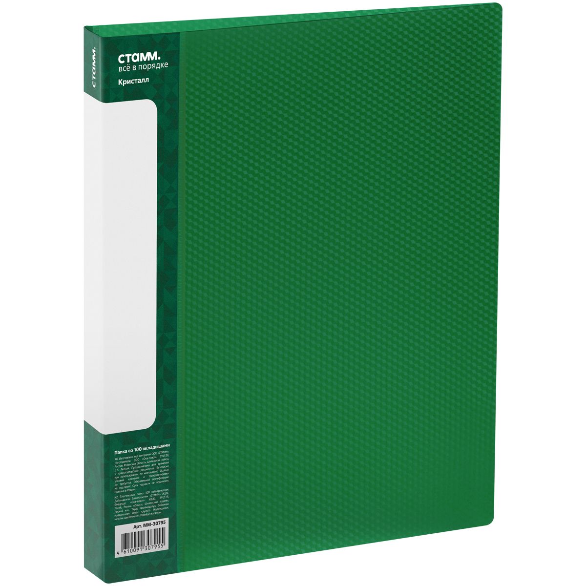 Папка со 100 вкладышами СТАММ "Кристалл" А4, 30мм, 800мкм, пластик, зеленая