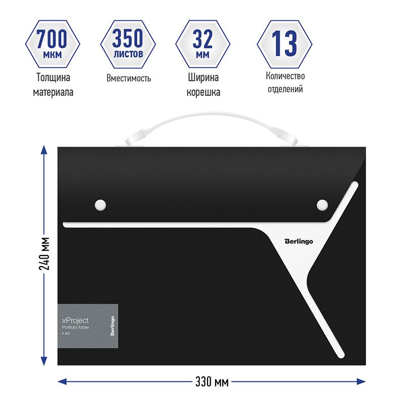 Папка-портфель 13 отделений Berlingo "xProject" А4, черная/белая, 700мкм
