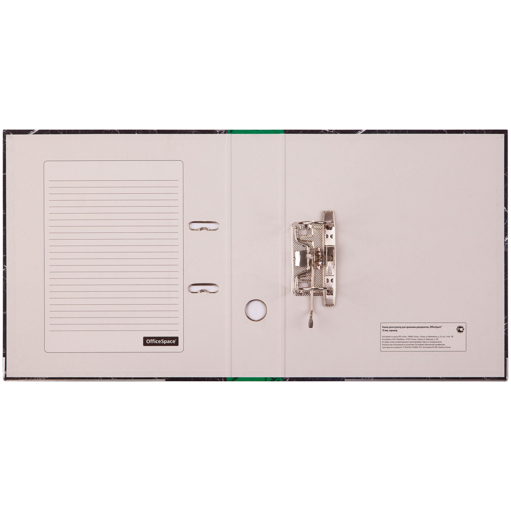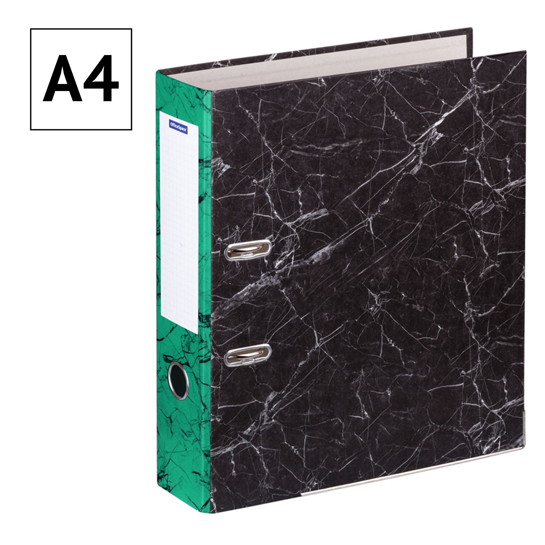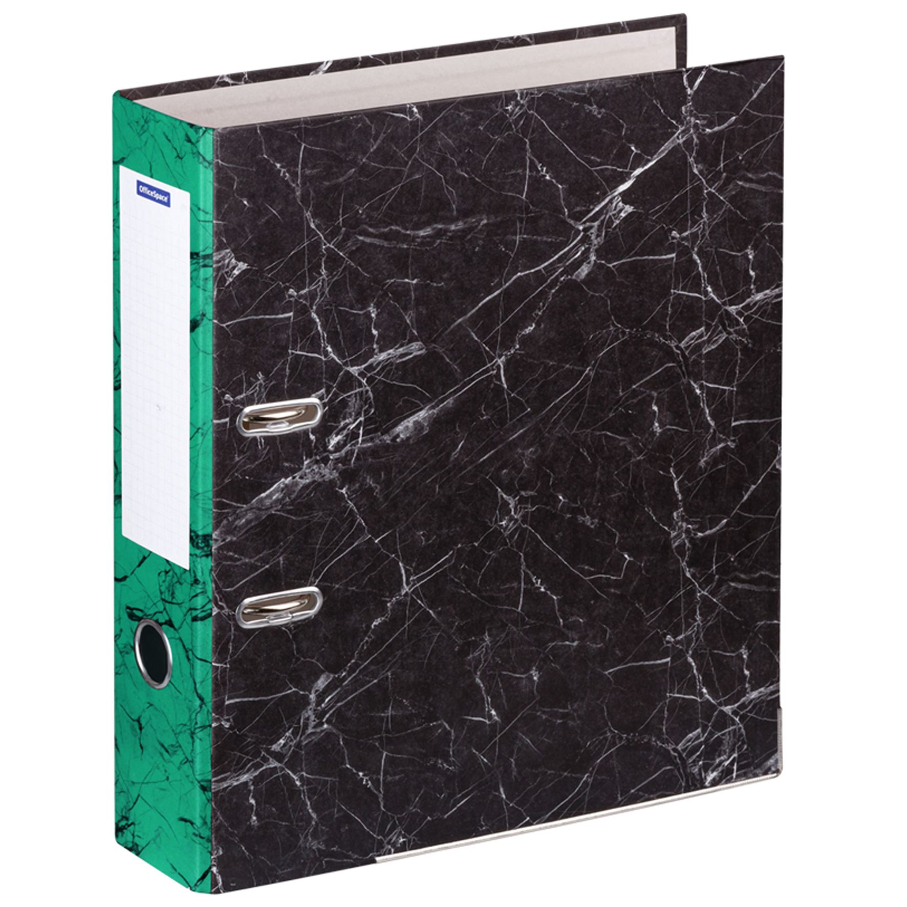 Папка-регистратор OfficeSpace 70мм, мрамор, черная, зеленый корешок, нижний метал. кант