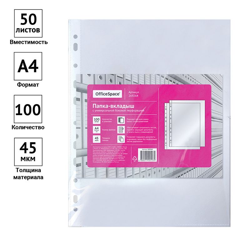 Папка-вкладыш с перфорацией (файл) OfficeSpace А4, 45мкм, глянцевая