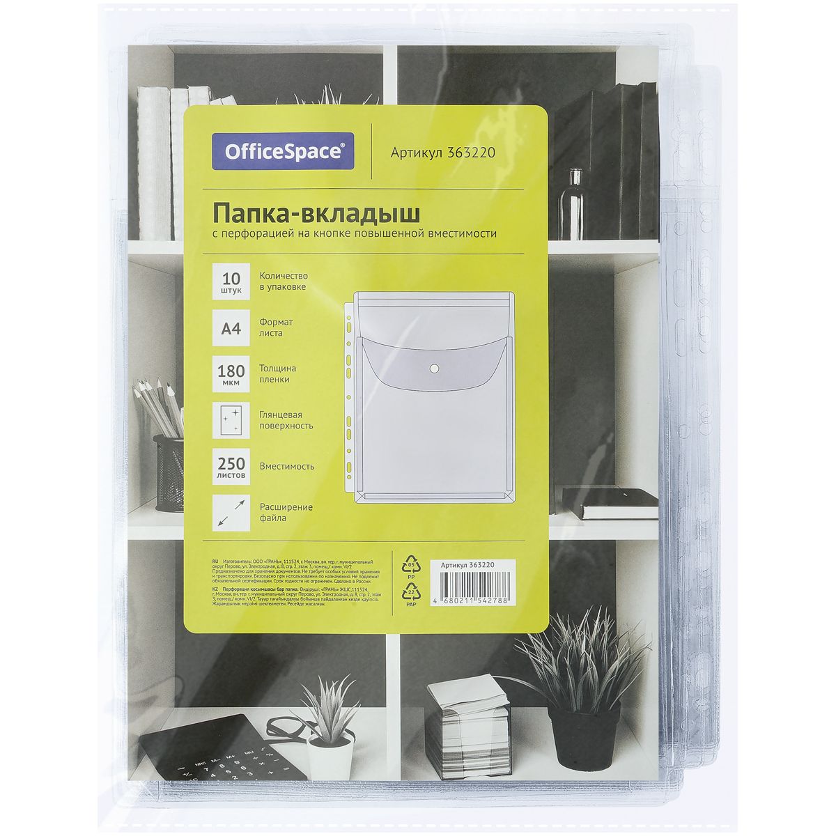 Папка-вкладыш с перфорацией на кнопке OfficeSpace А4, ПВХ, 180мкм, глянцевая, расширяющаяся до 250л.
