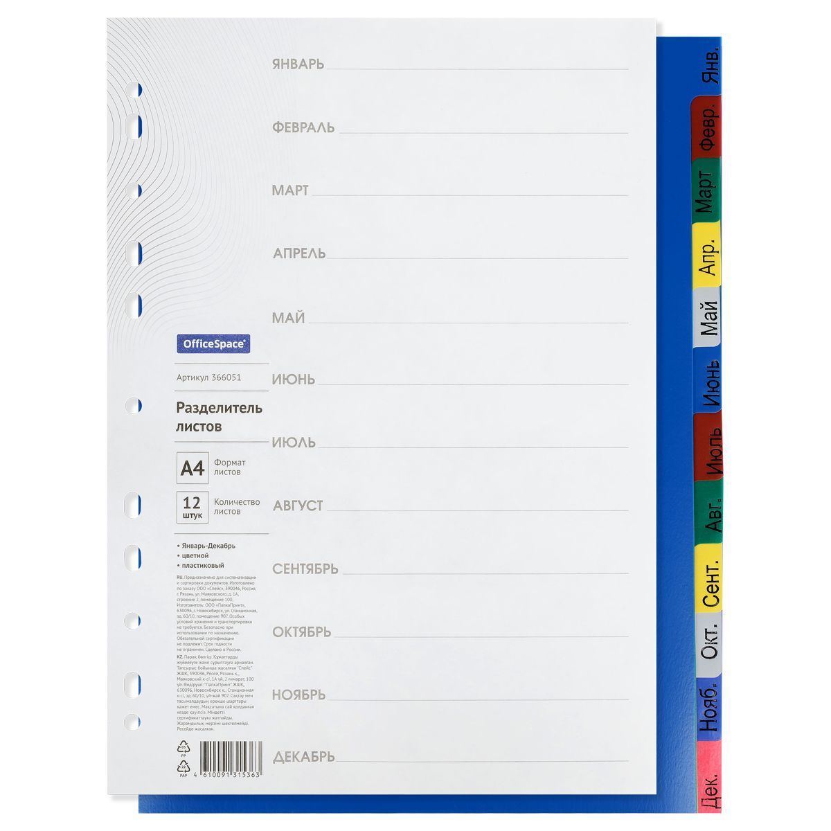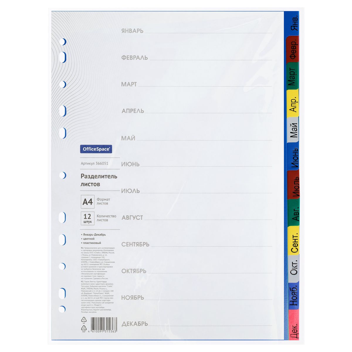 Разделитель листов OfficeSpace А4, 12 листов, Январь-Декабрь, цветной, пластиковый