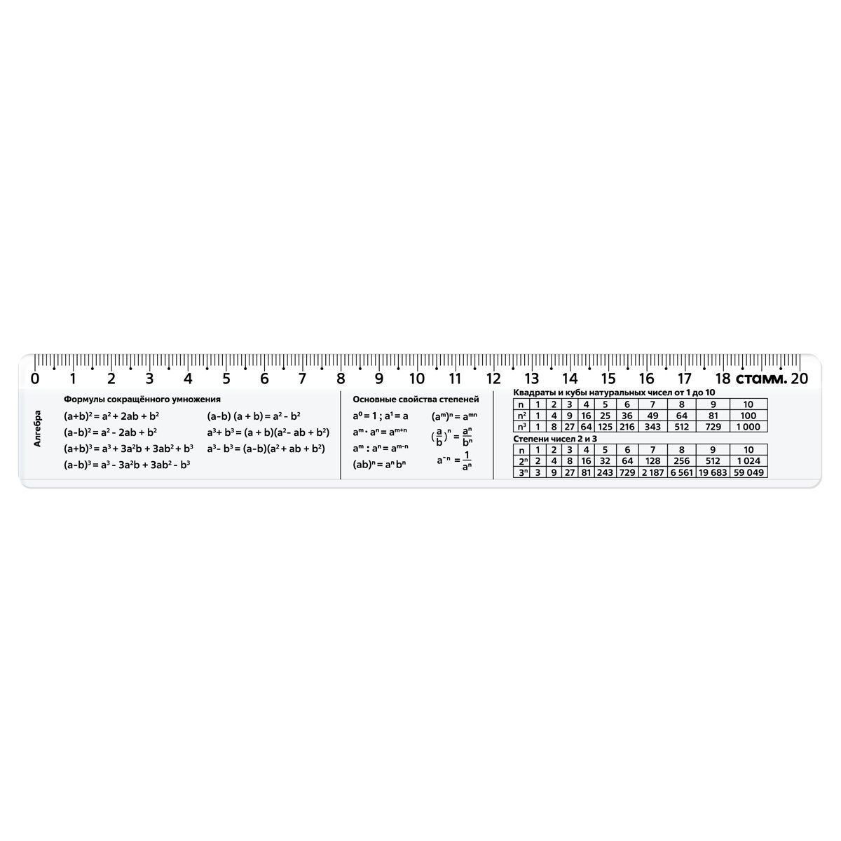 Линейка 20см СТАММ "Алгебра", со справочным материалом, пластиковая, прозрачная, бесцветная