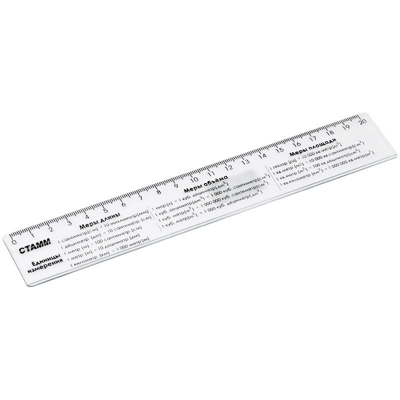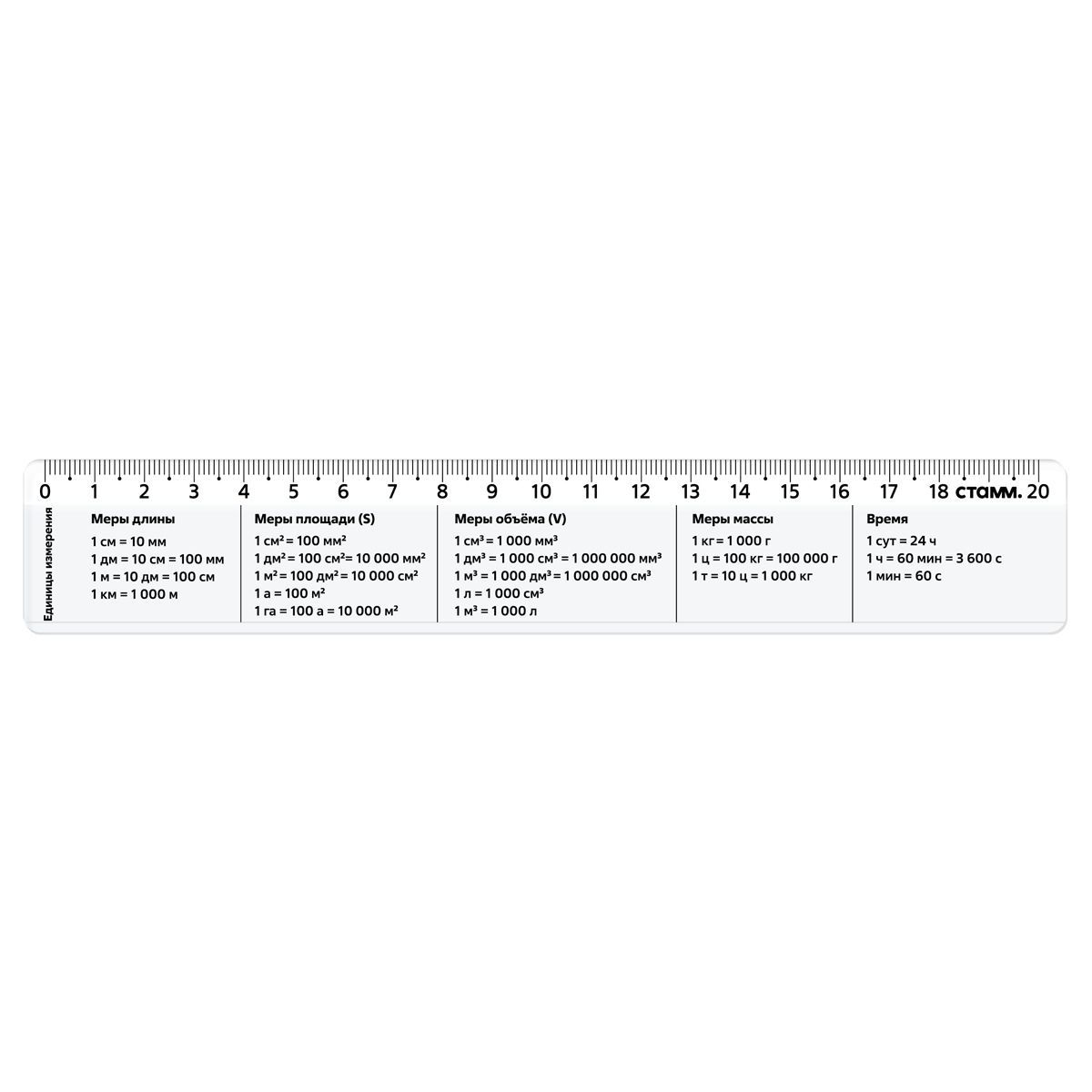 Линейка 20см СТАММ "Единицы измерения", со справочным материалом, пластиковая, прозрачная, бесцветная