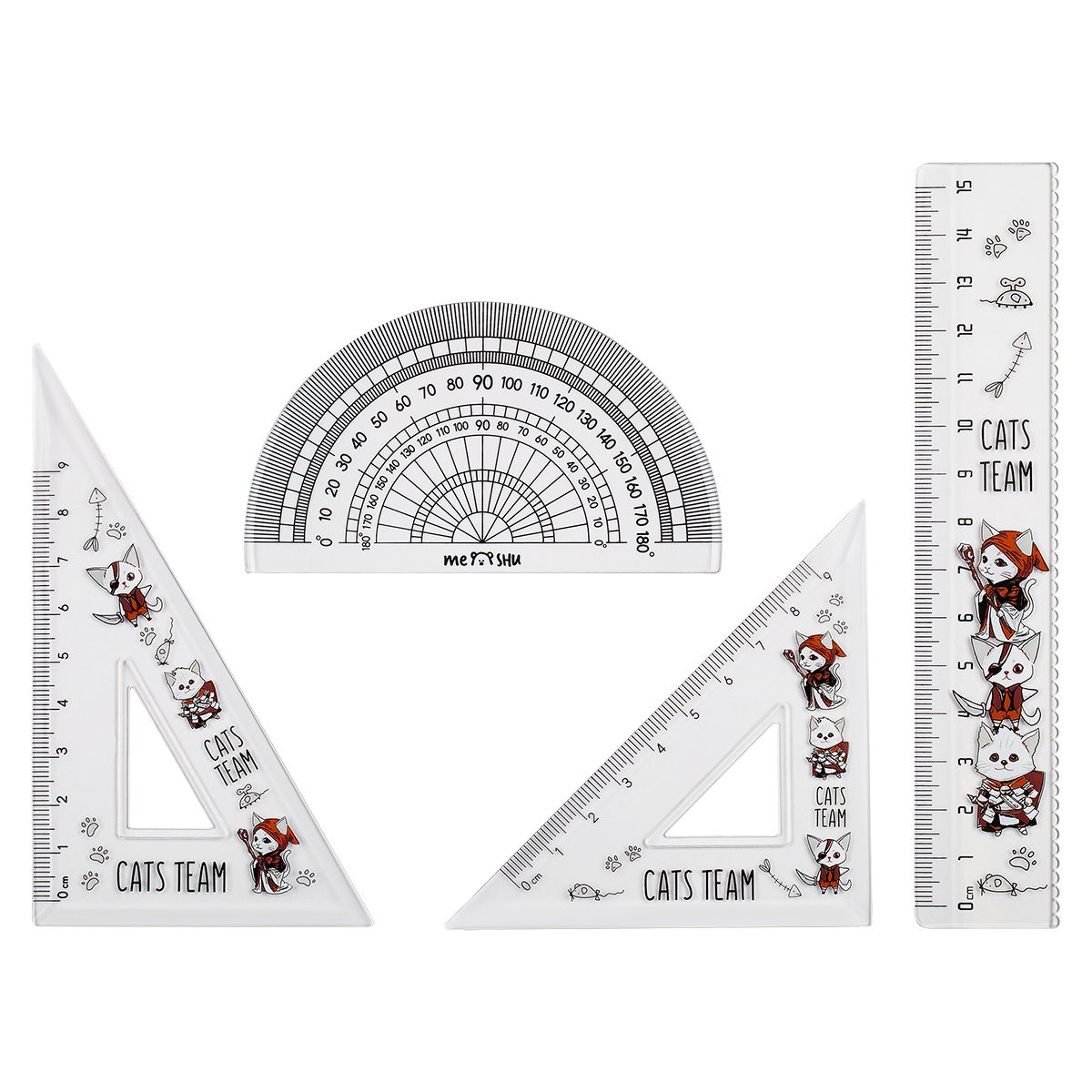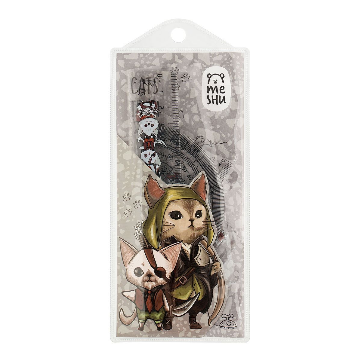 Набор чертежный MESHU "Cats Team" (линейка 15см, транспортир, 2 треугольника), пластик, ПВХ-пенал