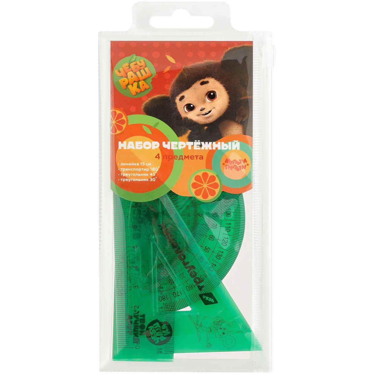 Набор чертежный Мульти-Пульти Чебурашка (линейка 15см, 2 треугольника, транспортир), тонированный, с принтом, ПВХ зип-чехол