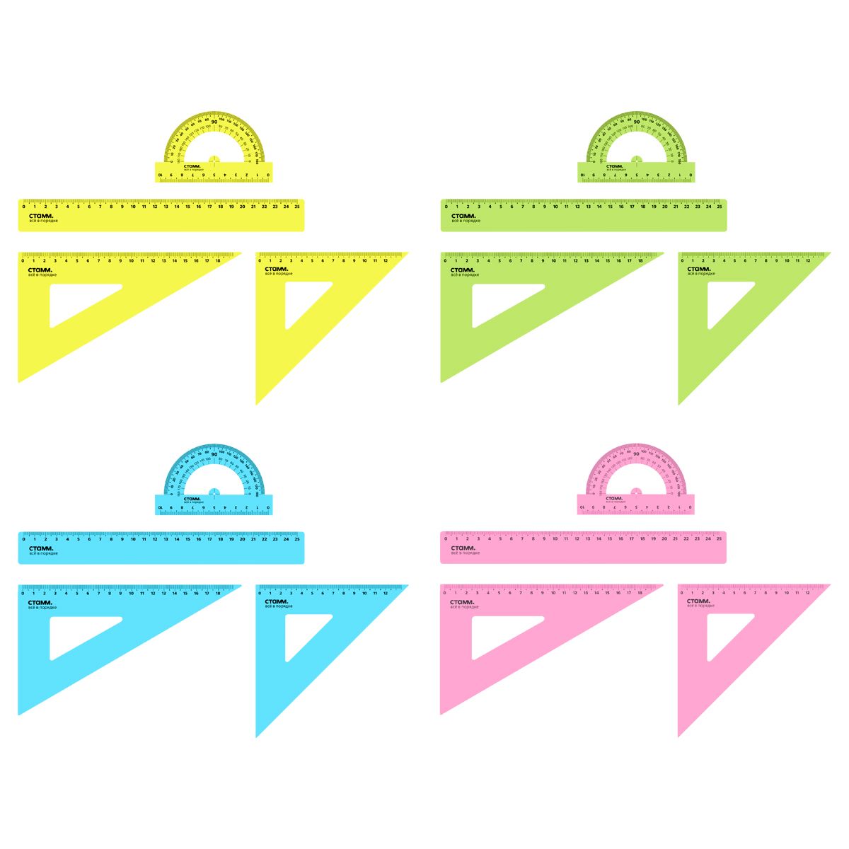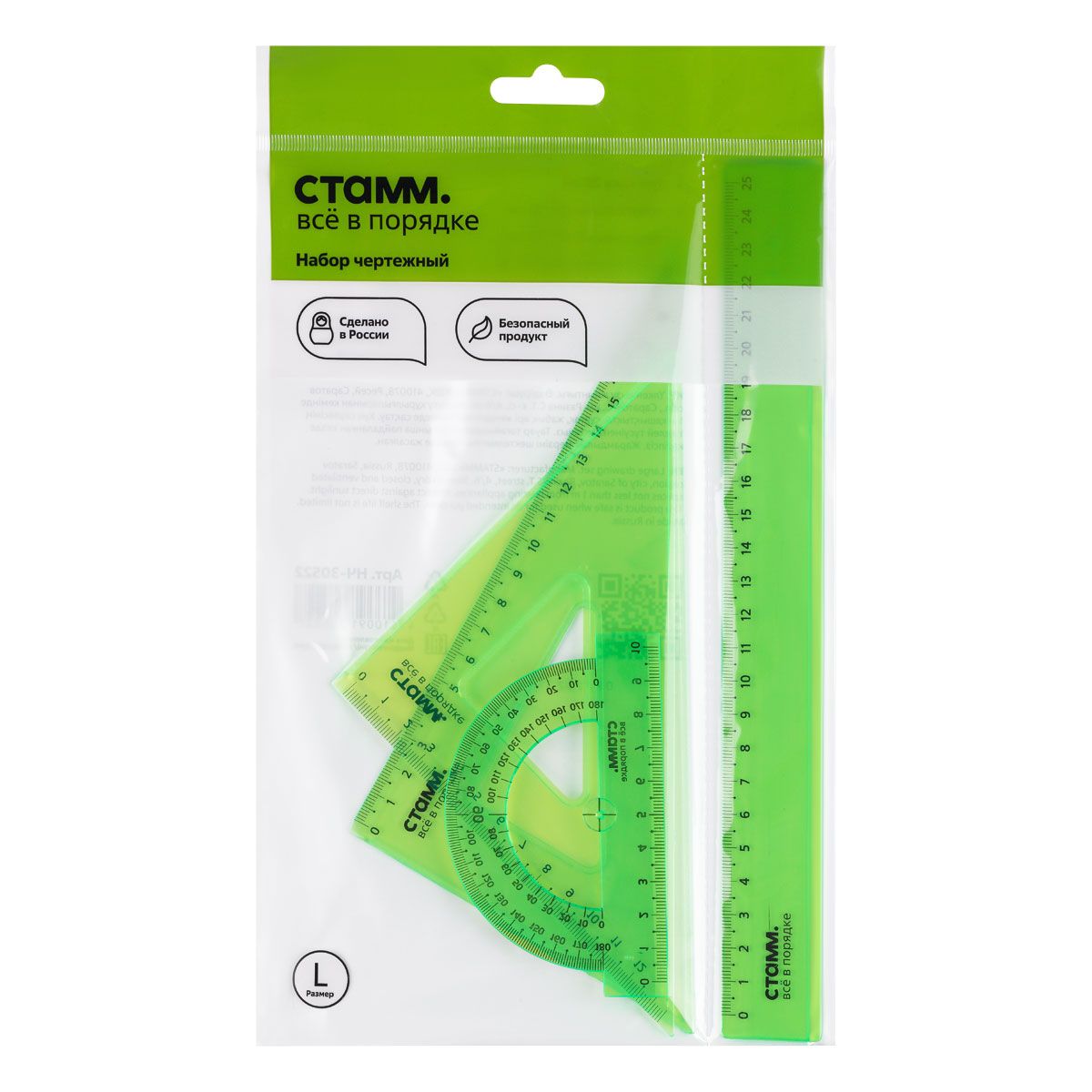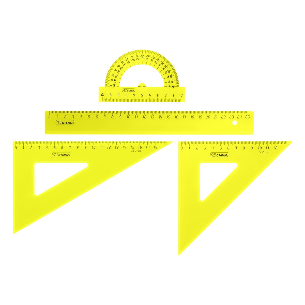 Набор чертежный СТАММ, размер L (линейка 25см, 2 треугольника, транспортир), прозрачный, неоновые цвета, ассорти, европодвес