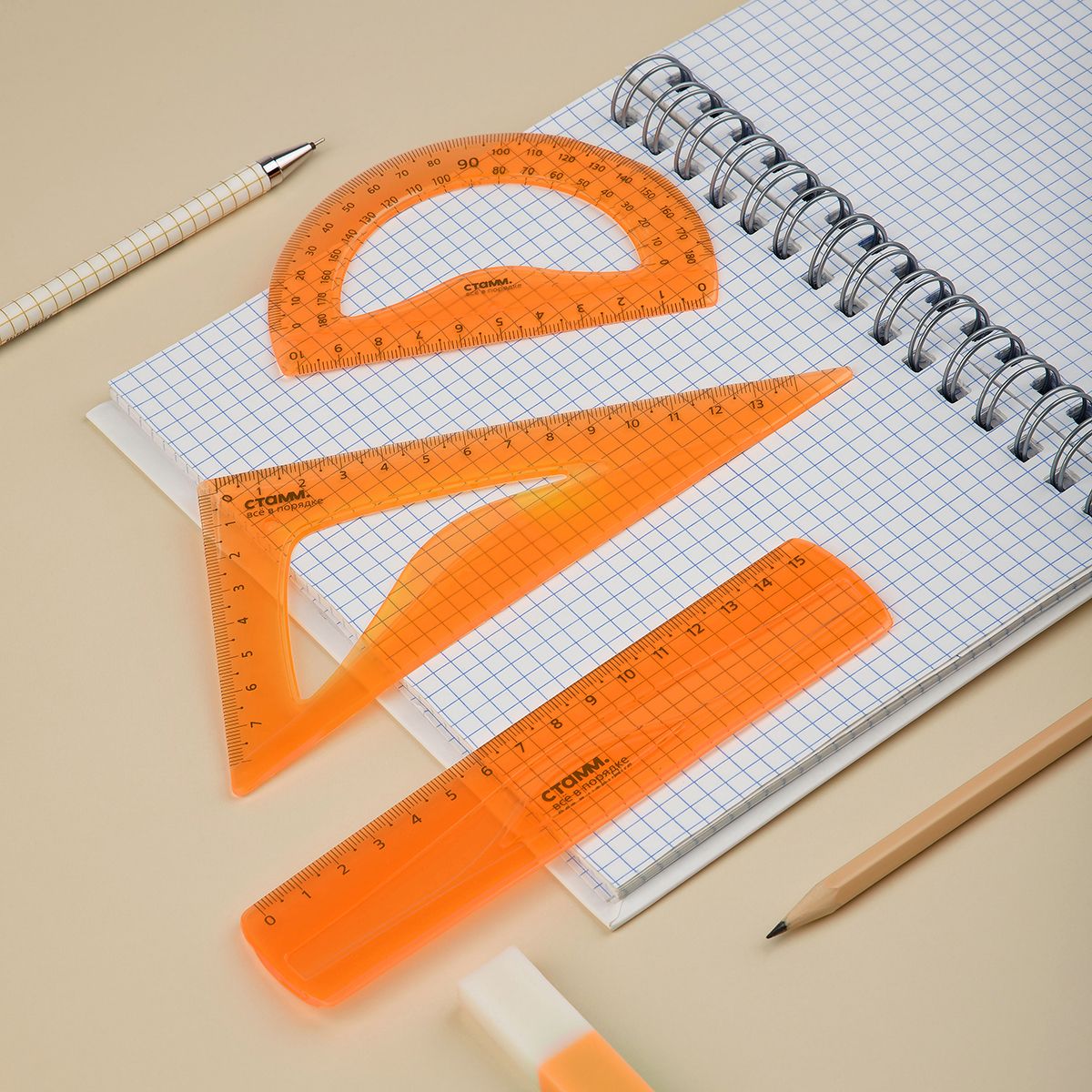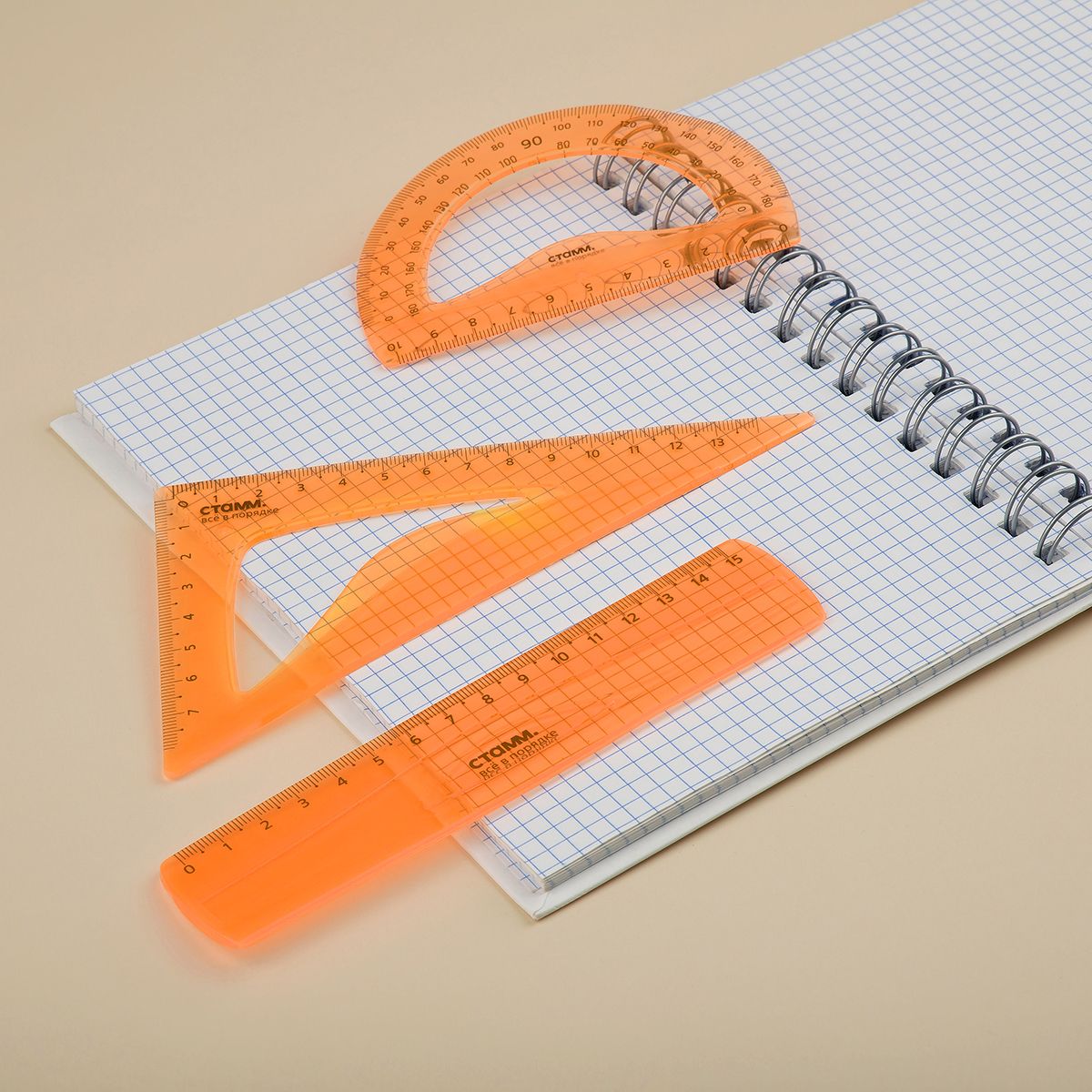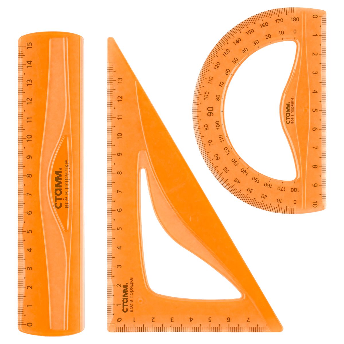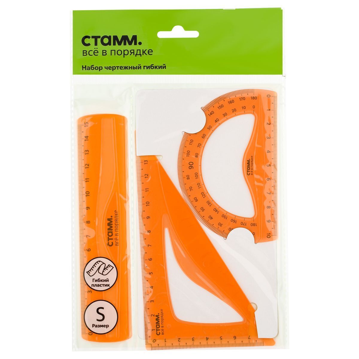 Набор чертежный СТАММ, размер S (линейка 15см, треугольник, транспортир), гибкий, прозрачный, оранжевый, европодвес