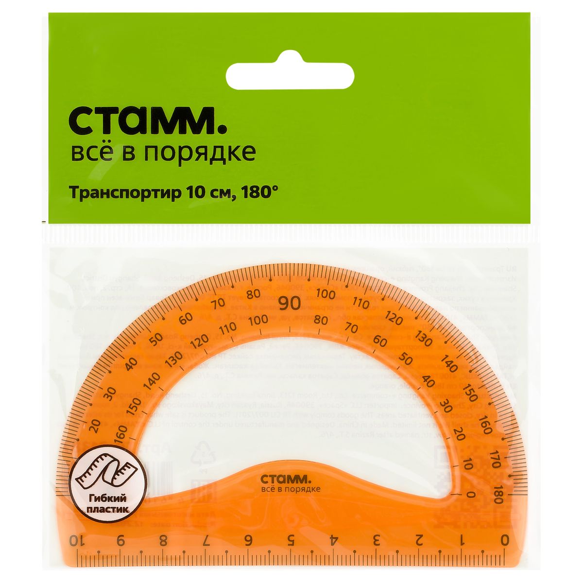 Транспортир 10см, 180° СТАММ, пластиковый, гибкий, прозрачный, оранжевый, европодвес