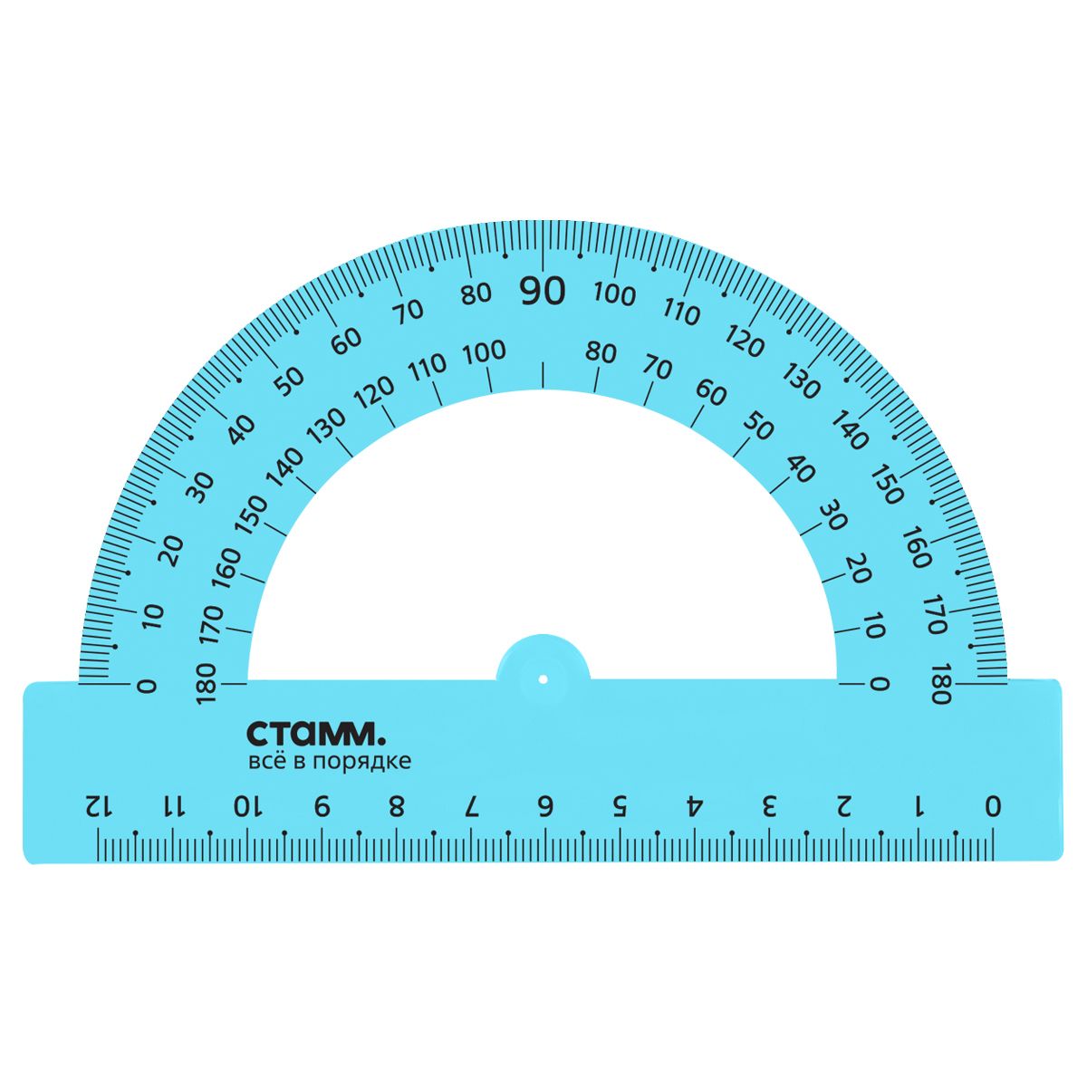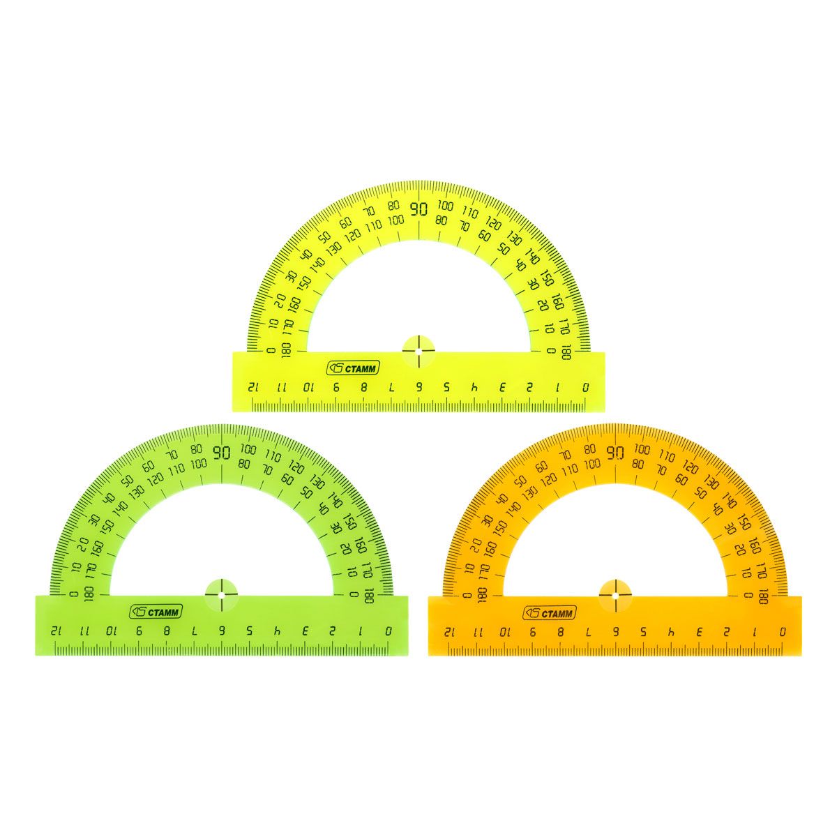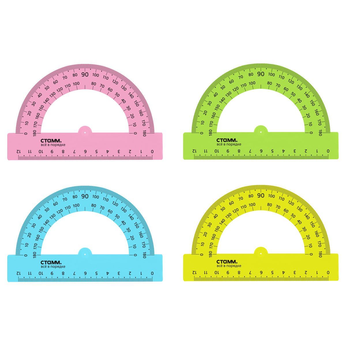 Транспортир 12см, 180° СТАММ, пластиковый, прозрачный, неоновые цвета, ассорти