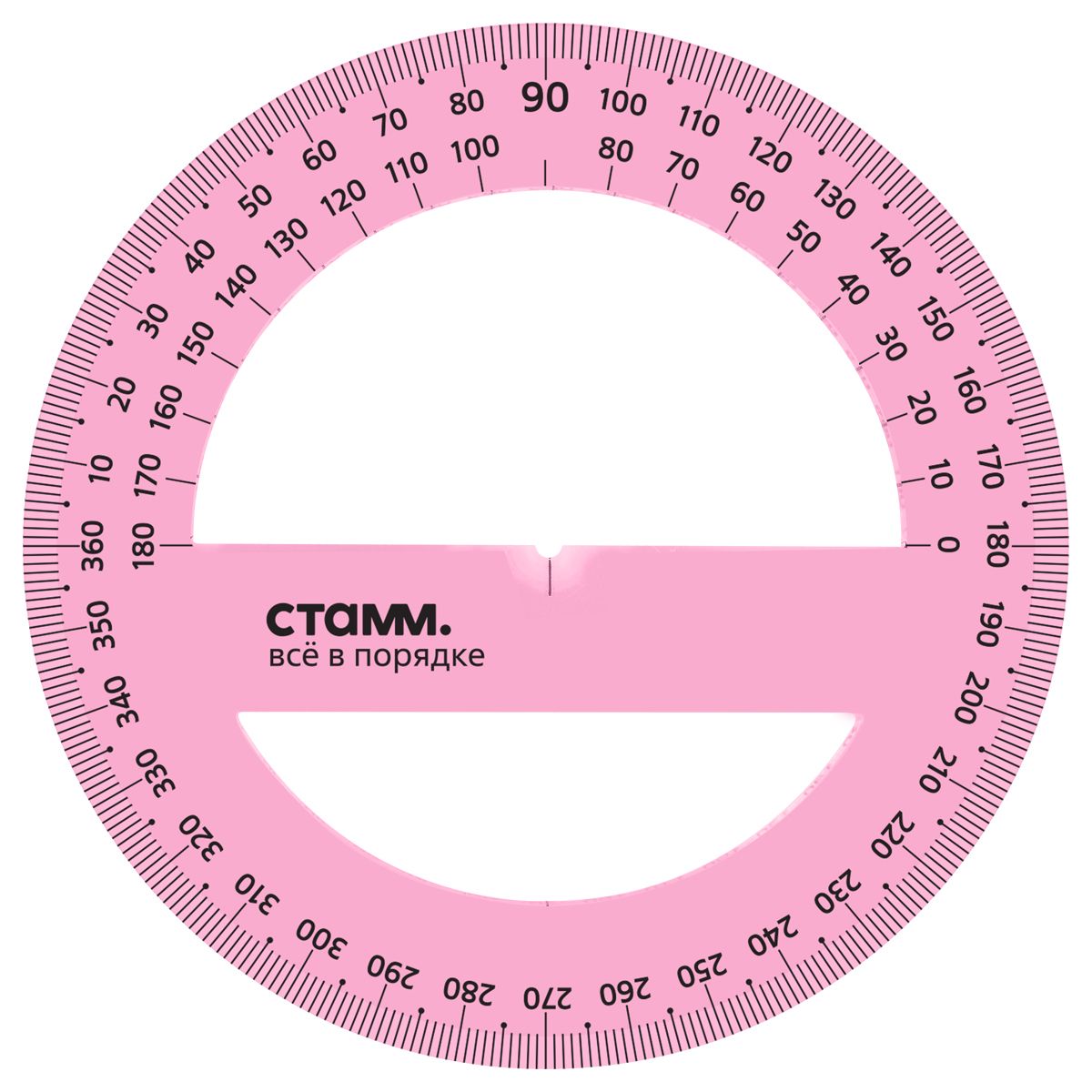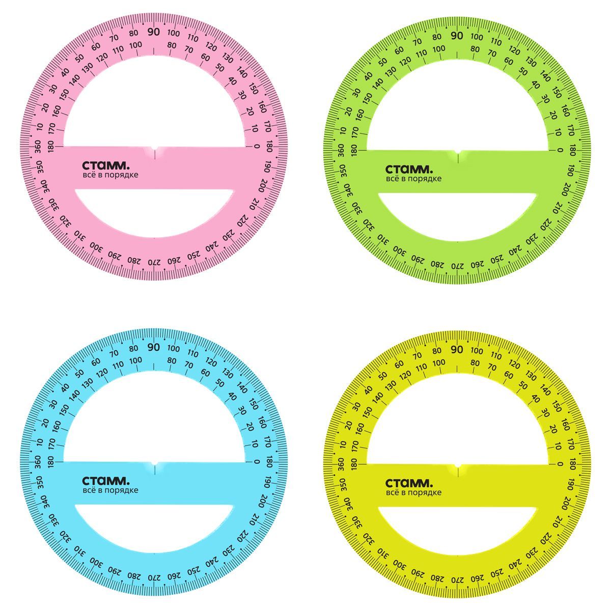 Транспортир 12см, 360° СТАММ, пластиковый, прозрачный, неоновые цвета, ассорти