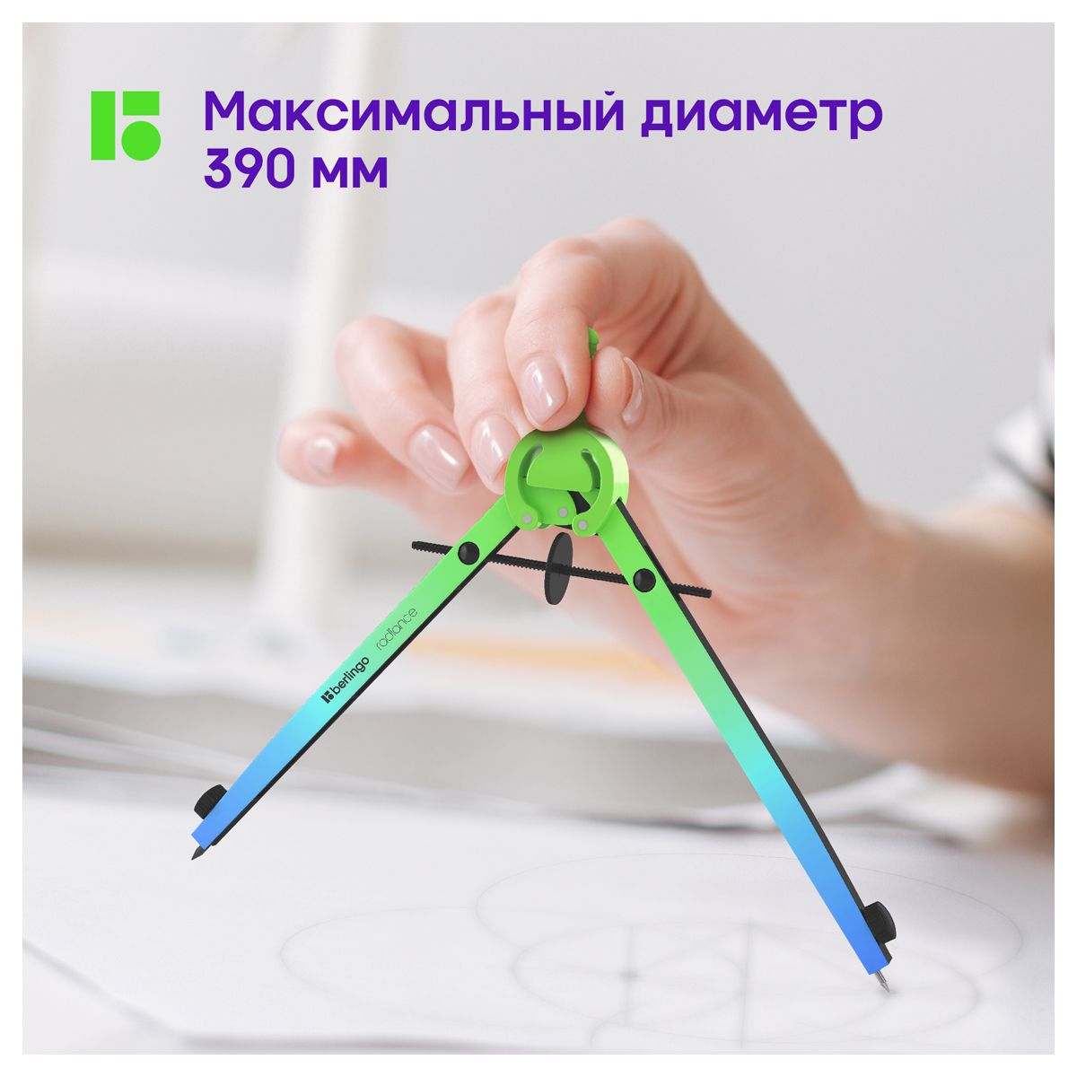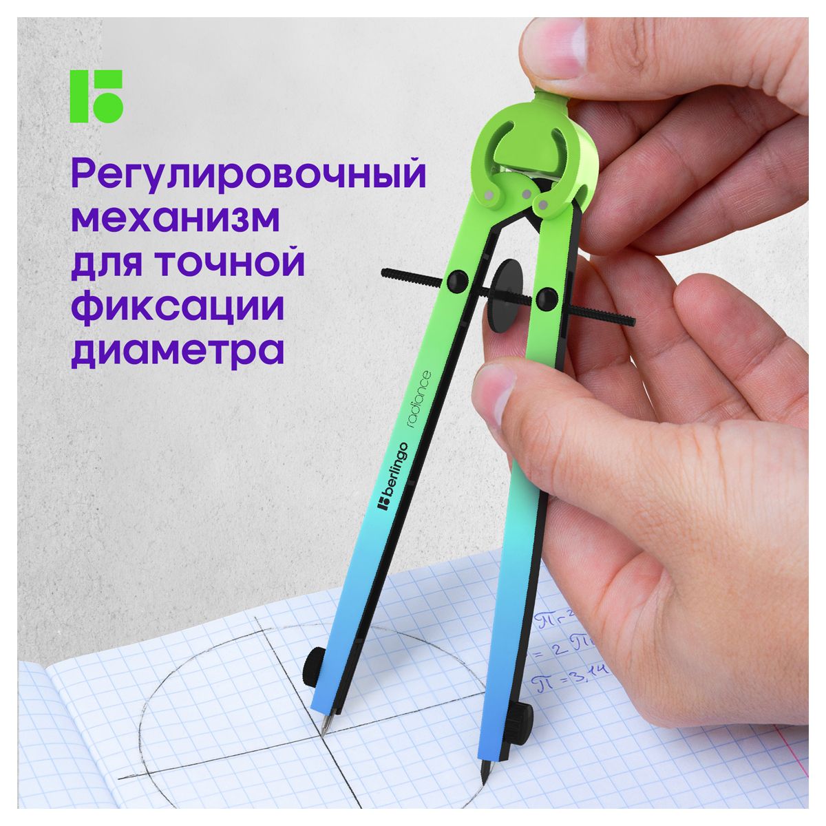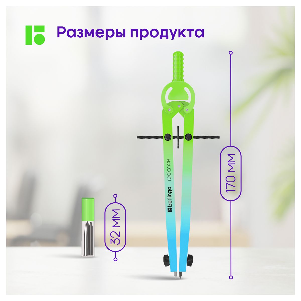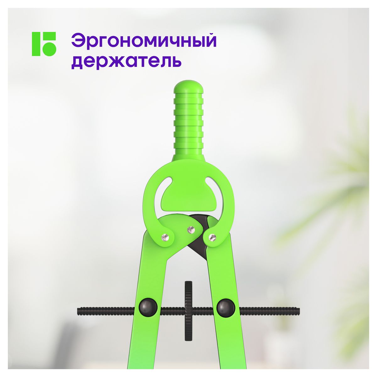 В состав набора входят: циркуль с эргономичной головкой и пенал с запасным грифелем.