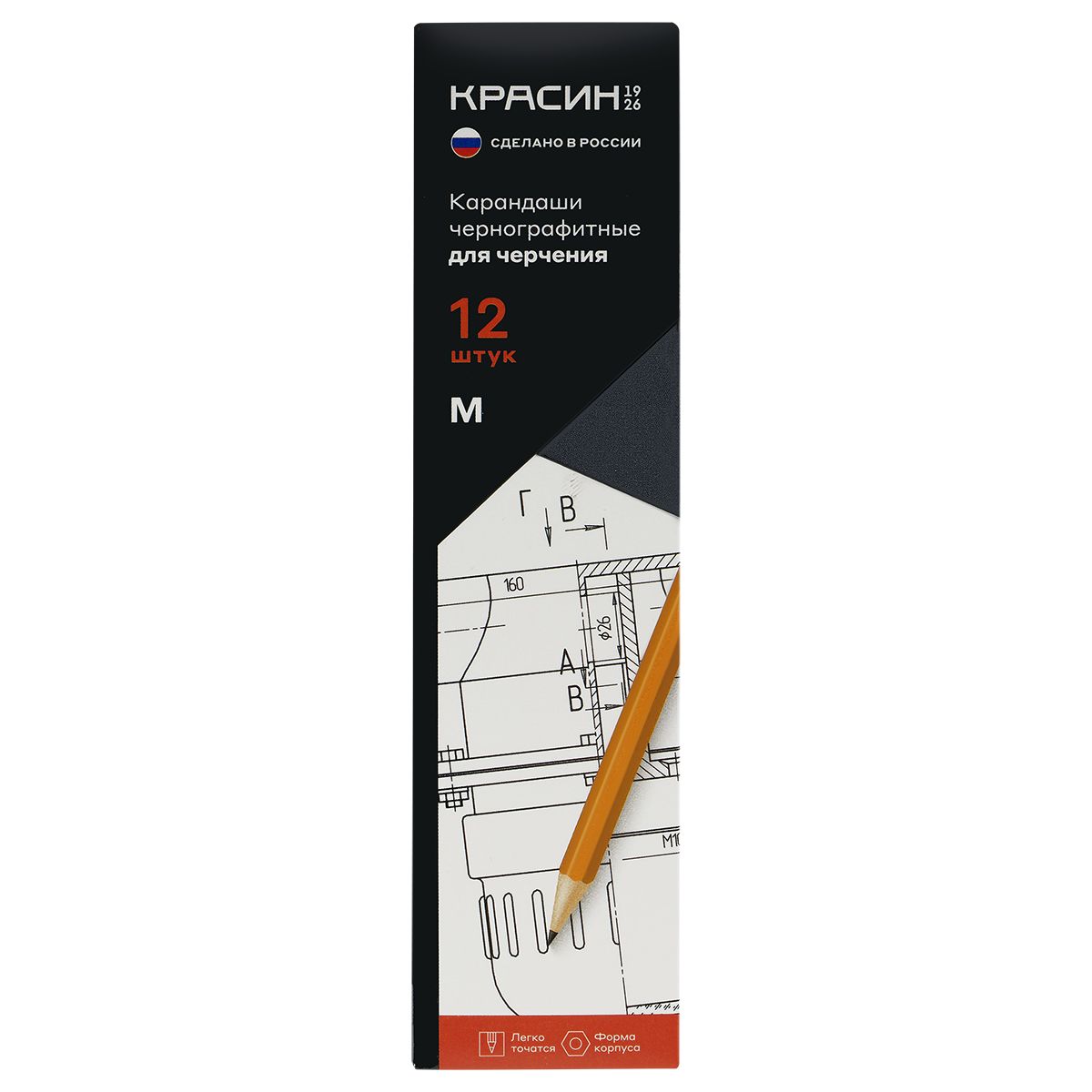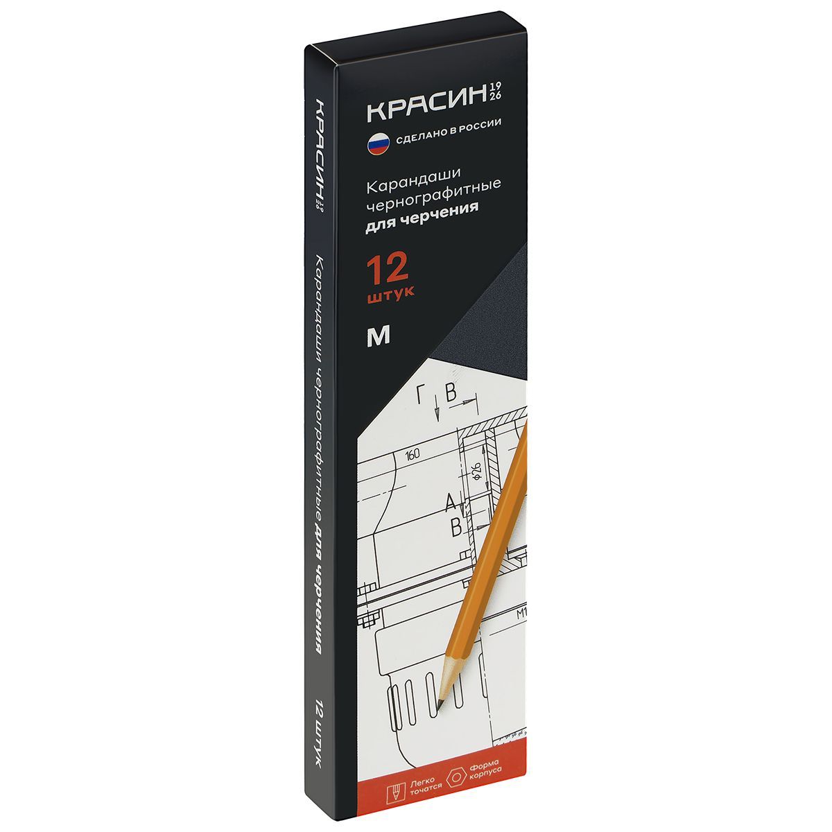 Карандаши с маркировкой твёрдости М (В) используют для создания рамки, нанесения толстых линий на чертеже. Корпус карандашей выполнен из российской древесины липы, имеет шестигранное сечение. Высококачественный грифель не крошится и не ломается при заточке. Карандаши легко и удобно затачивать. Они поставляются заточенными, имеют диаметр 7 мм и длину 177 мм. Карандаши упакованы в картонную коробку. В одной упаковке 12 штук.