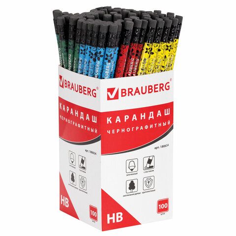 Карандаш чернографитный BRAUBERG, 1 шт., "Fuete", НВ, c ластиком, черное дерево, корпус ассорти, 180634