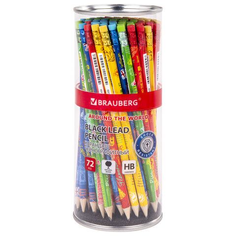 Карандаш чернографитный BRAUBERG "AROUND THE WORLD", 1 шт., HB, с ластиком, корпус ассорти, 181747
