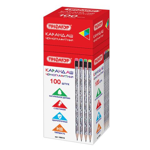 Карандаш чернографитный ПИФАГОР, 1 шт., НВ, с ластиком ассорти, фольгированный корпус (серебряный), 180618