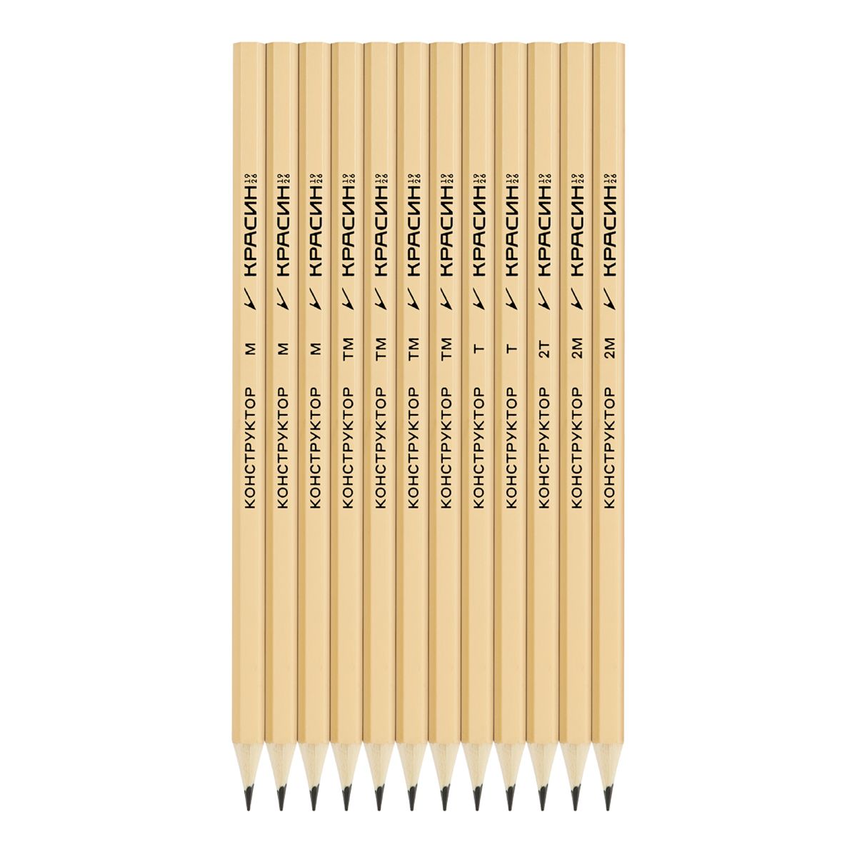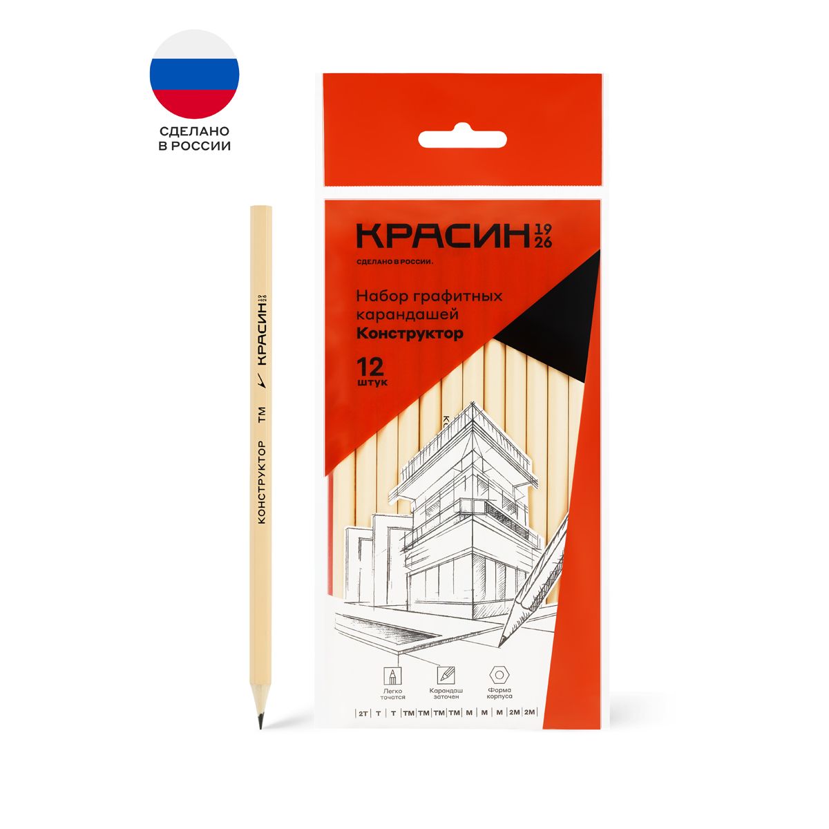 Набор карандашей ч/г Красин "Конструктор" 12шт., 2Т (2Н), Т (Н)-2, ТМ (НВ)-4, М (В)-3, 2М (2В)-2, шестигран., заточен., ПП пакет, европодвес