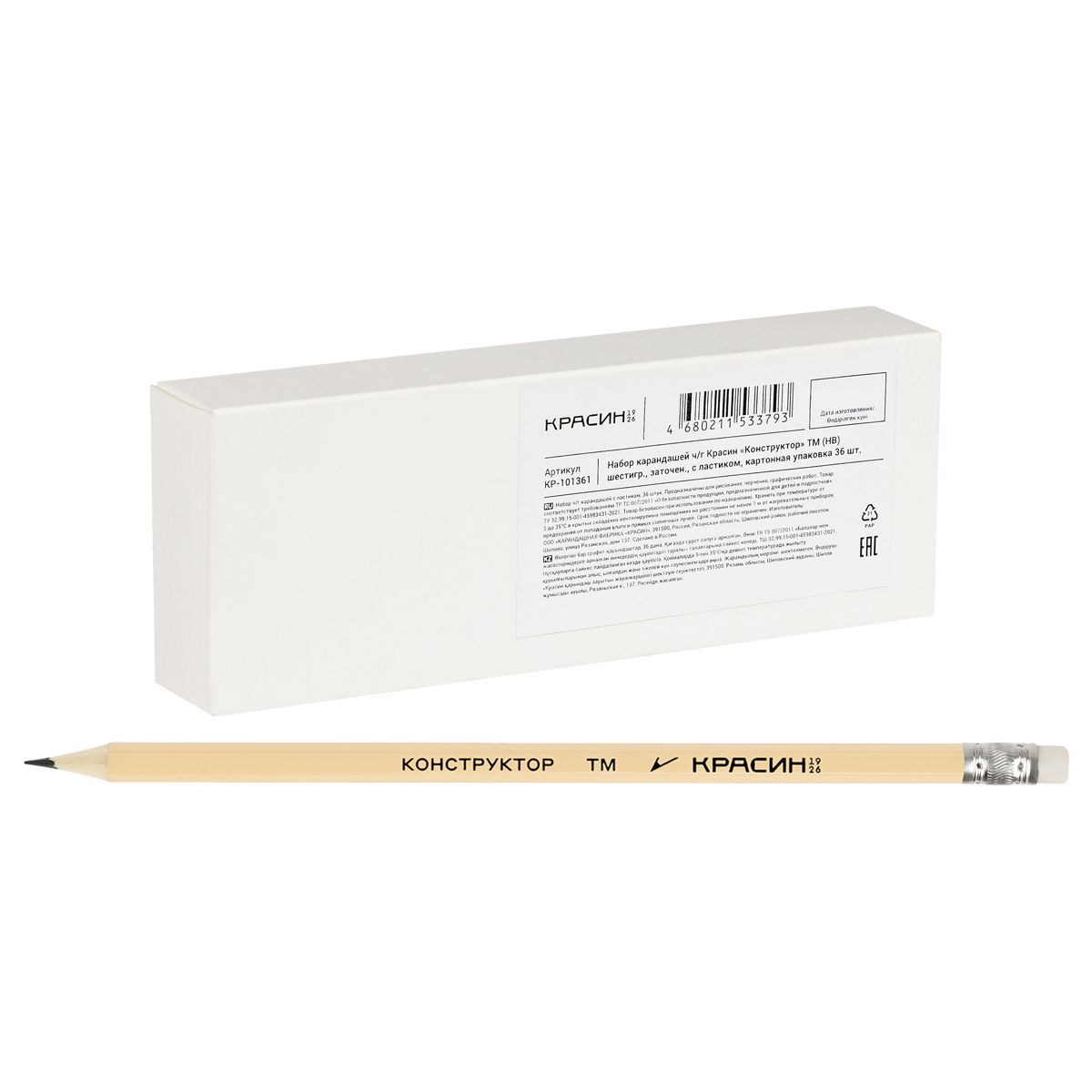 Набор карандашей ч/г Красин "Конструктор" ТМ (HB) 36шт., шестигр., заточен., с ластиком, картонная упаковка