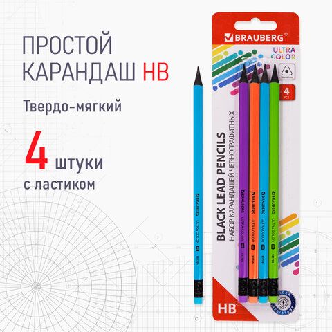 Набор карандашей чернографитных BRAUBERG "ULTRA COLOR" 4 шт., HB, с ластиком, пластиковые, 181709