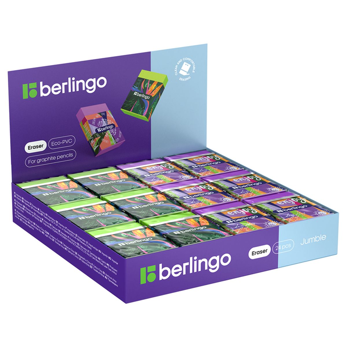 Каждый ластик упакован в картонный держатель и пленку, которые защищают ластик от грязи и пыли. У каждого ластика есть штрих-код. Дизайн выполнен в стиле коллекции Berlingo 2023 "Jumble".