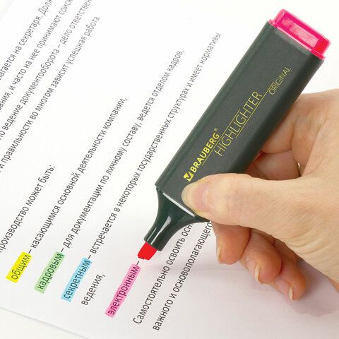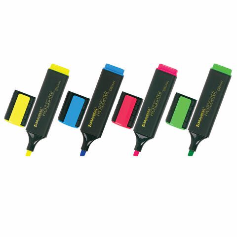 Офисные и ученические текстовыделители используются для подчёркивания ключевых фраз в тексте. Многие из них оснащены скошенным наконечником, который позволяет менять толщину линии — от 1 до 5 мм. Такая конструкция делает их удобными при работе с различными шрифтами и форматами текста.