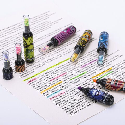 Для творческих задач и оформления презентаций подойдут яркие наборы и маркеры с необычным дизайном. Некоторые текстовыделители имеют вытянутую форму корпуса и позволяют писать линией от 1 до 4 мм, обеспечивая комфорт и точность в работе.