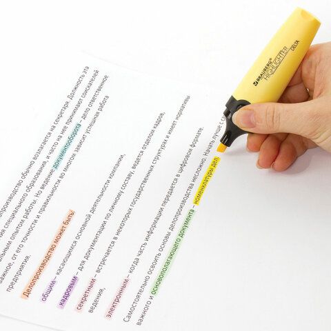 Офисные и ученические текстовыделители используются для подчёркивания ключевых фраз в тексте. Многие из них оснащены скошенным наконечником, который позволяет менять толщину линии — от 1 до 5 мм. Такая конструкция делает их удобными при работе с различными шрифтами и форматами текста.
