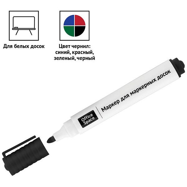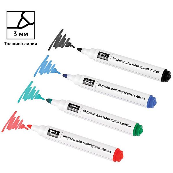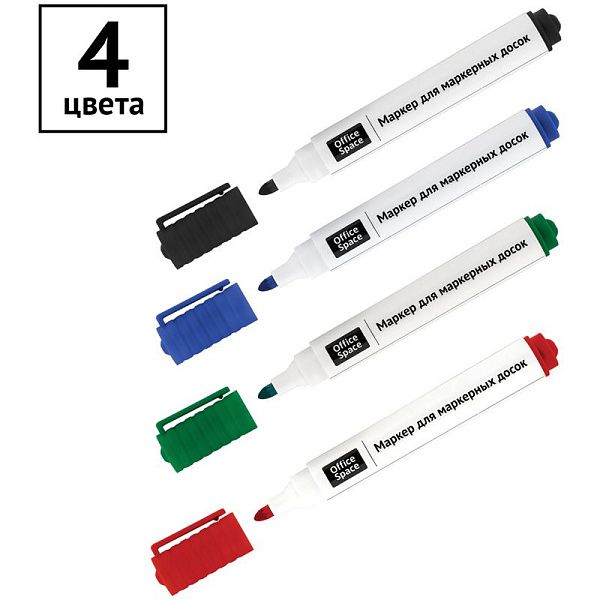 Прочный фибровый наконечник не западает в корпус и сохраняет форму на протяжении всего срока службы маркера. След от маркера легко удаляется сухой губкой. Пулевидный наконечник позволяет наносить яркие и однородные линии толщиной 2 мм.. Цвет чернил - зеленый, синий, черный, красный. Количество в наборе: 4 цвета.