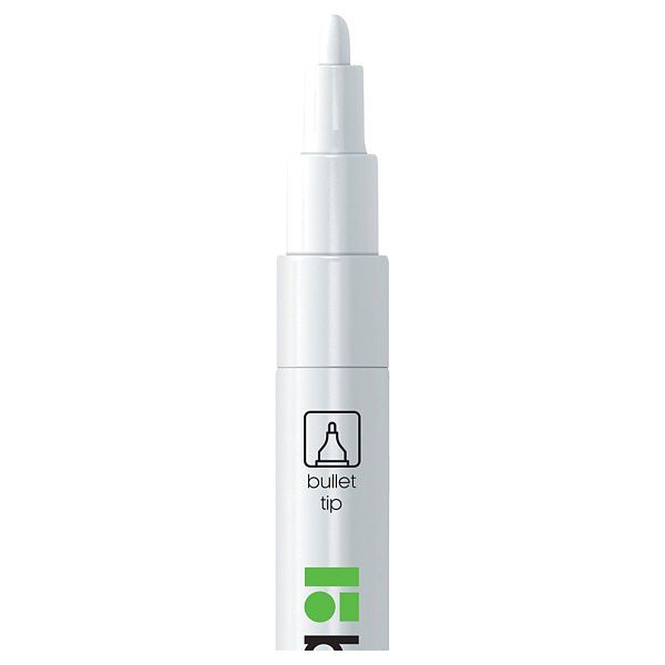 - Перманентный белый маркер с круглым наконечником диаметром 2–4 мм. Отлично подходит для создания контрастных надписей на тёмных и глянцевых поверхностях.