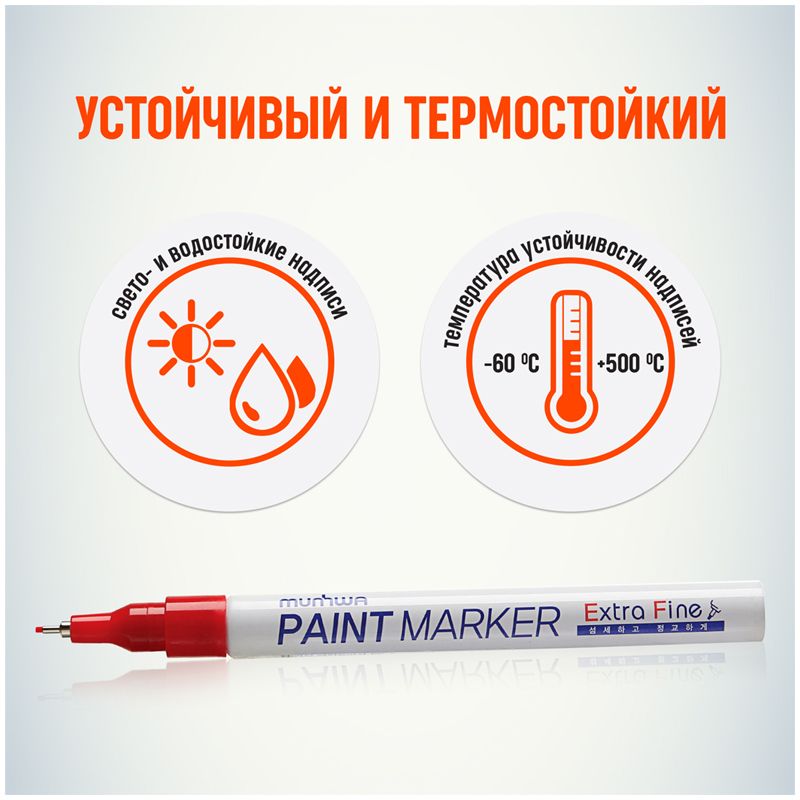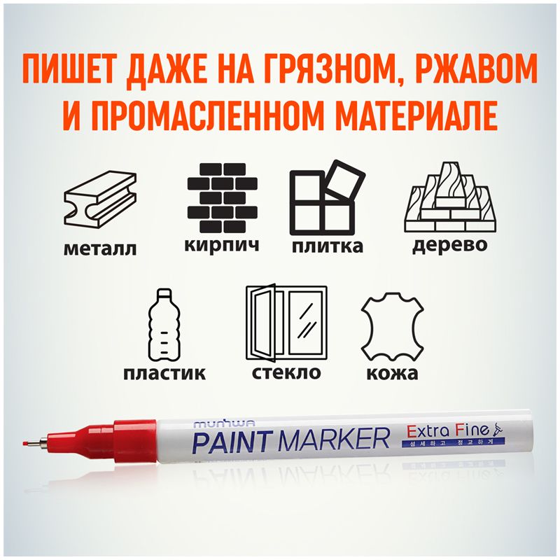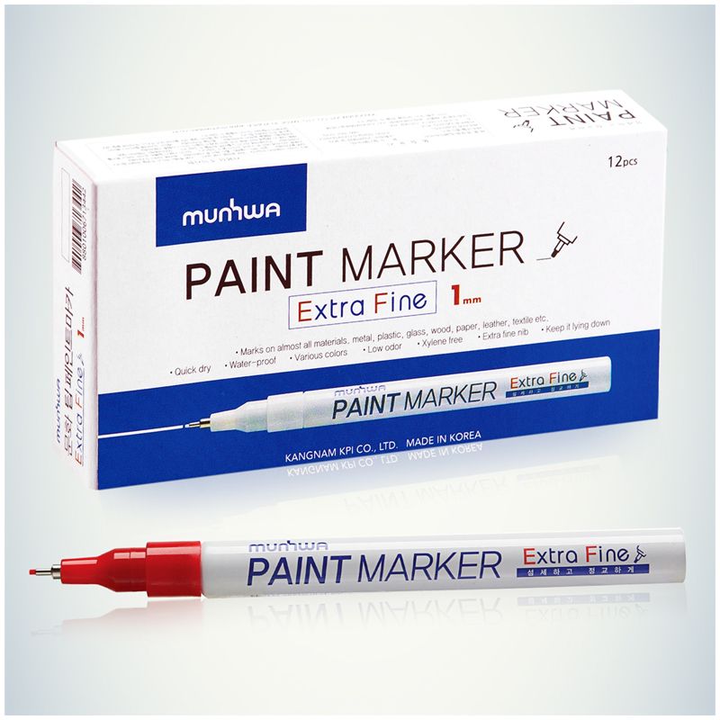 Маркер-краска MunHwa Extra Fine предназначен для нанесения деликатной маркировки на гладкие поверхности (металл, пластмасса, резина, кожа и пр.). Отлично подходит для маркировки фото пленок и рентгеновских снимков, имеет широкое применения в дизайне, декорировании и оформлении.