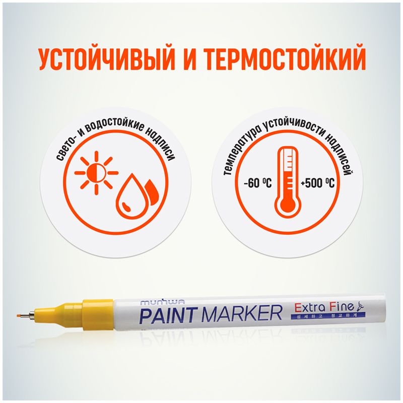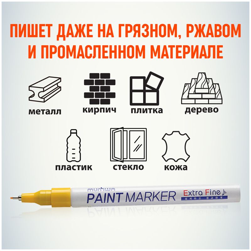 Маркер-краска MunHwa Extra Fine предназначен для нанесения деликатной маркировки на гладкие поверхности (металл, пластмасса, резина, кожа и пр.). Отлично подходит для маркировки фото пленок и рентгеновских снимков, имеет широкое применения в дизайне, декорировании и оформлении.