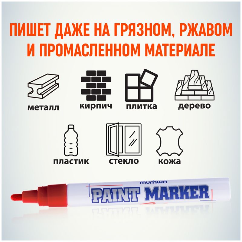 Paint Marker подходит для реставрации дефектов на бытовой технике, обуви, кузове автомобиля, а также надписей на каменных плитах. Маркер-краска MunHwa имеет широкое применения в дизайне, декорировании и оформлении.