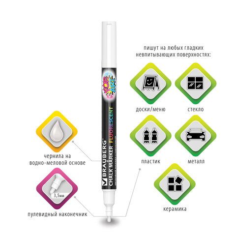 Маркер меловой "POP-ART" БЕЛЫЙ, 3,5 мм, стираемый, для гладких поверхностей, BRAUBERG, 151519