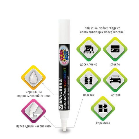 Маркер меловой "POP-ART" БЕЛЫЙ, 5 мм, стираемый, для гладких поверхностей, BRAUBERG, 151527